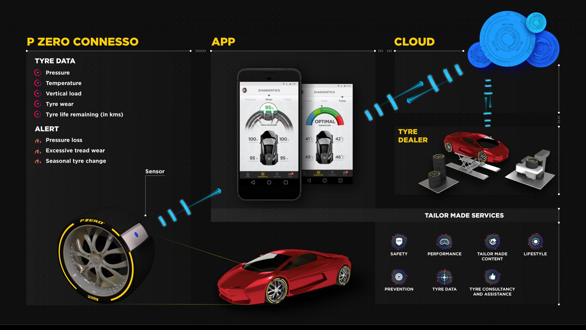 Vgrajeni senzorji bodo beležili številne podatke o pnevmatikah, kot so temperatura, tlak, obraba in obremenitev pnevmatike, ter odštevali preostale kilometre. Vmesnik bo te podatke dostavljal na smarttelefon. Če ne bo vse, kot bi moralo biti, bo lastnik o tem obveščen. Še več. Connesso vam v primeru okvare pnevmatike predlaga bližnjega vulkanizerja in vas po želji tudi sam naroči.