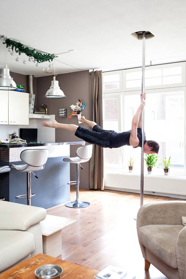 Den nederlandske fotografen Bart Erkamp bryter ned fordommer om poledansing med fotoserien Pole Fitness at Home (2014).