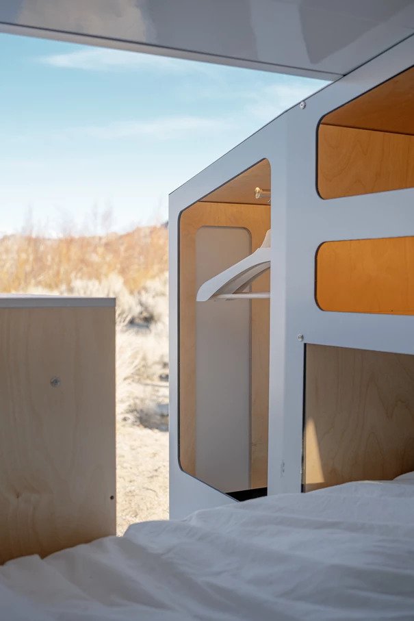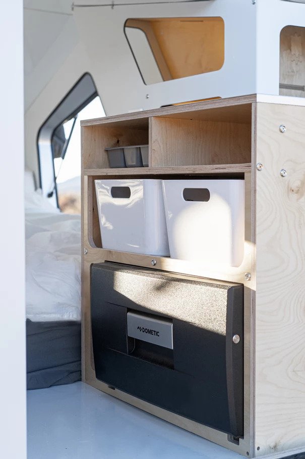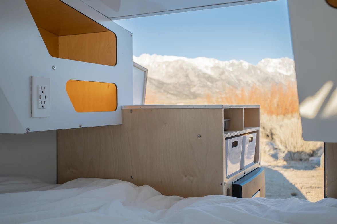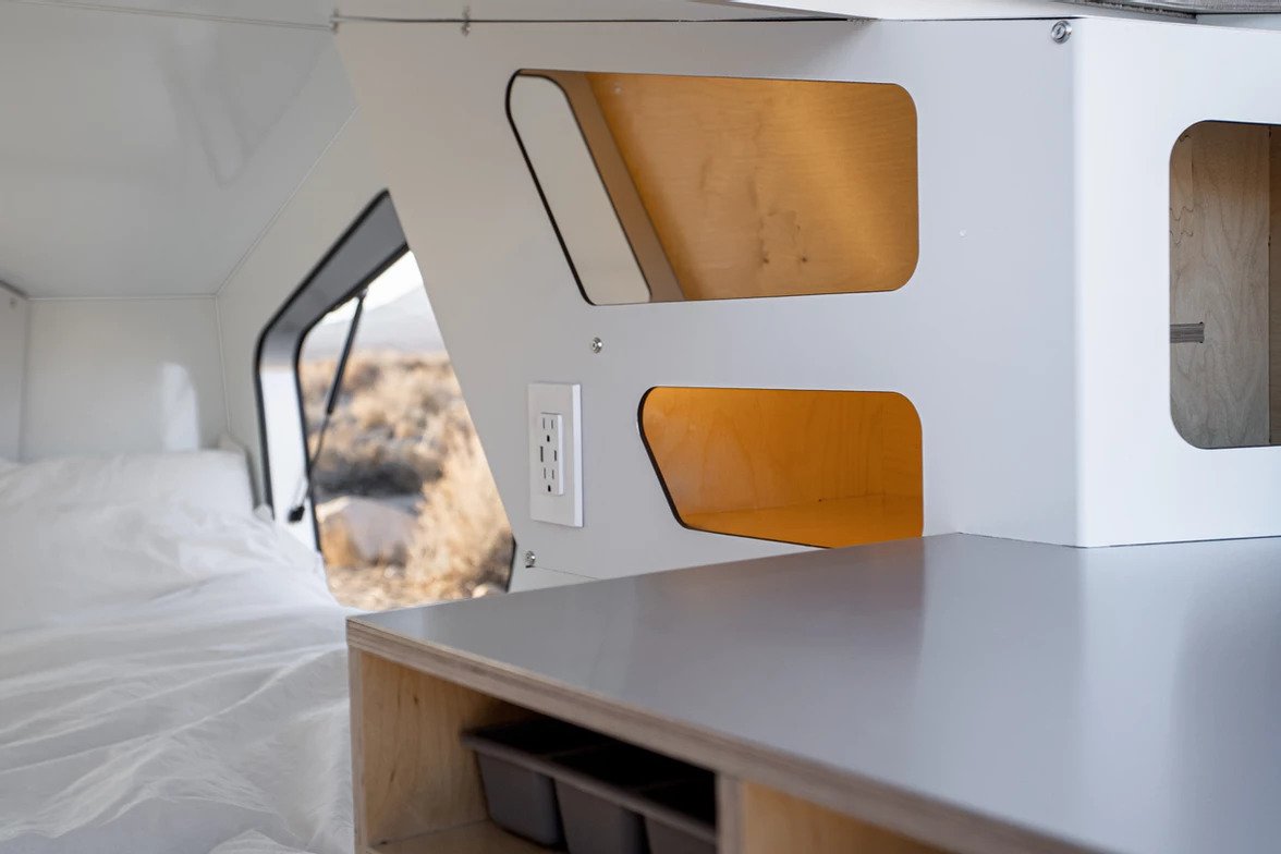 Den passer inni tilhengeren full størrelse madrass, og det er også et lite skap på baksiden. Brukere kan til og med legge til en kjøkkenmodul som er tilgjengelig både inne i hytta og utenfor. Det er også LED-belysning, valgfrie Bluetooth-høyttalere, en 12-volts-kontakt, 2 USB-ladeporter og en 110-volts-kontakt.