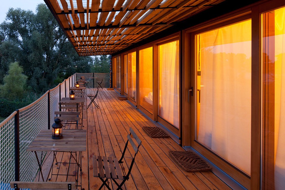 To 6-metrska og 12-metrski zabojnik tvorijo kopalnico, Toalett, garderobni prostor in 4 spalne prostore. Vsak spalni prostor ima stekleno steno z izhodom na leseno teraso. Notranjost prostorov je izdelana iz brezovih vezanih plošč, za streho pa so uporabili recikliran les, tako da je poleti v notranjosti še vedno prijetna temperatura. Hotel, ki so ga postavili v samo 4 mesecih, sprejme 12 gjester in je brez dvoma projekt, o kakršnih bomo morali razmišljati v prihodnosti, če želimo ohraniti okolje v boljšem stanju.