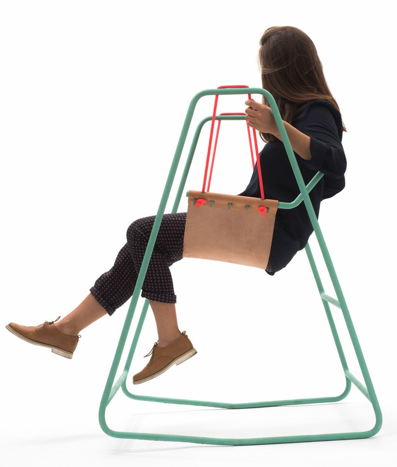 “Rocking Chair” je ultimativno orodje za medgeneracijsko zabavo, igriva kombinacija otroške gugalnice in babičinega gugalnika, ki nas nežno ziblje in igrivo guga. Minimalistično oblikovan pohištveni kos, ki govori dva jezika – gugalnice in gugalnika – je sestavljen le iz bistvenega – železnega okvirja, usnjenega sedeža in vrvi, brez vijakov in nepotrebnih zunanjih elementov. Lahkoten in mobilen, je pohištveni kos “Rocking Chair”, ki ga odlikujejo čiste linije in živahne barve, pravi nomad, ki nežno ziba, ko to najbolj potrebujemo.