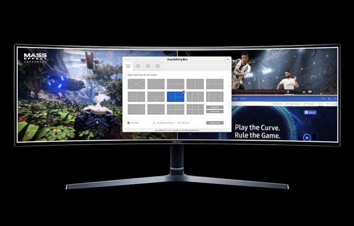 ‘Ultraširoki’ zasloni niso prav dolgo časa med nami, saj smo jih prvič lahko preizkusili lani. No, z modelom CHG90 er på Samsung šli še korak dlje, ali raje korak v širino, saj omenjeni CHG90 spada bolj v ‘superultraširoko’ kategorijo. Razmerje med širino in višino stranic je kar 32 : 9. Da si lažje predstavljate, ‘klasični’ ultraširoki zasloni imajo to razmerje 21 : 9, medtem ko navadni zasloni dosežejo 16 : 9. V bistvu sta to dva zaslona full HD (1080p), združena v enega. Zaradi ukrivljenosti zaslona (178-stopinjski vidni kot) lahko uporabljamo perifert syn, zaradi česar bomo bistveno manj obračali glavo. Ločljivost 3840 x 1080, izjemno hiter odzivni čas (1 milisekunda) in osvežitvena frekvenca 144 Hz poskrbijo za nabor izjemnih lastnosti. Format HDR10 omogoča izboljšanje barv in svetlobe na enak način kot pri HD-televizorjih. Tehnologija AMD FreeSync 2 pa skrbi, da grafična kartica brez težav komunicira z zaslonom.