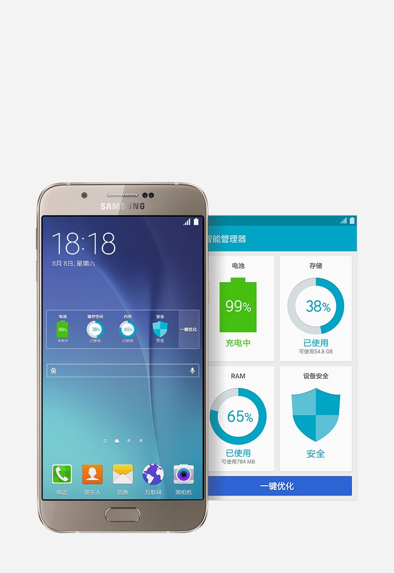 Under 5,7-tommers skjerm Super Amoled med en oppløsning på 1920 x 1080 piksler, finner vi en 8-kjerners og 64-bits prosessor Snapdragon 615Dette er en statistikk 2 GB systemminnesom «mater» operativsystemet Android 5.1 Lollipop med husgrensesnitt TouchWizGalaxy A8 kommer med 16 GB eller 32 GB innebygd lagringsplass, som kan utvides via microSD-kort. opptil 128 GBTil tross for den flate magen har den et ganske kraftig batteri med en kapasitet på 3050 mAh, men tilbyr også nettverksstøtte 4G/LTEPå baksiden har vi et 16-megapikselkamera (med en blenderåpning på f/1.9), og webkameraet på pannen telte 5000 av dem.