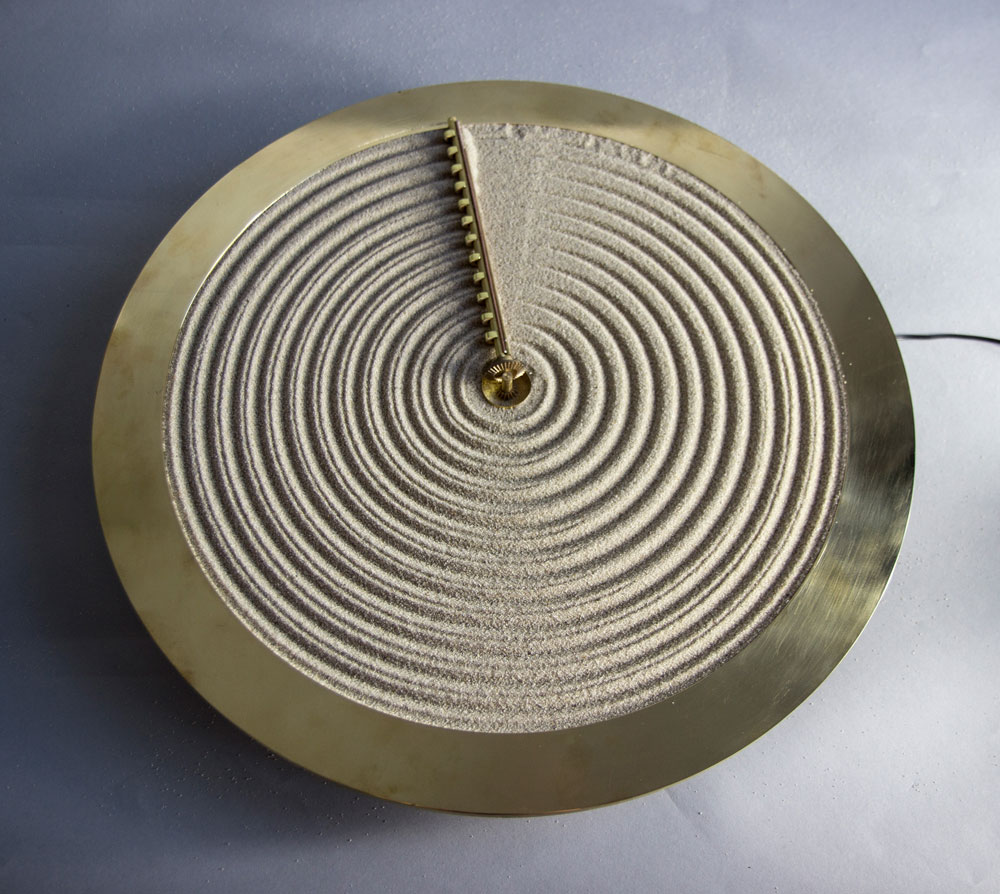 Sand er ikke et klassisk timeglass. Den består nemlig ikke av et stativ og en "klemt" flaske, men en klokke i form av en veggklokke, som forteller tiden ved å tegne bølgete hypnotiske mønstre av parallelle linjer ved hjelp av en rive/peker i sanden. , som om en traktor pløyde en åker. Den er inspirert av Zen-hager og er like beroligende som å rake sand og beundre en slik hage.