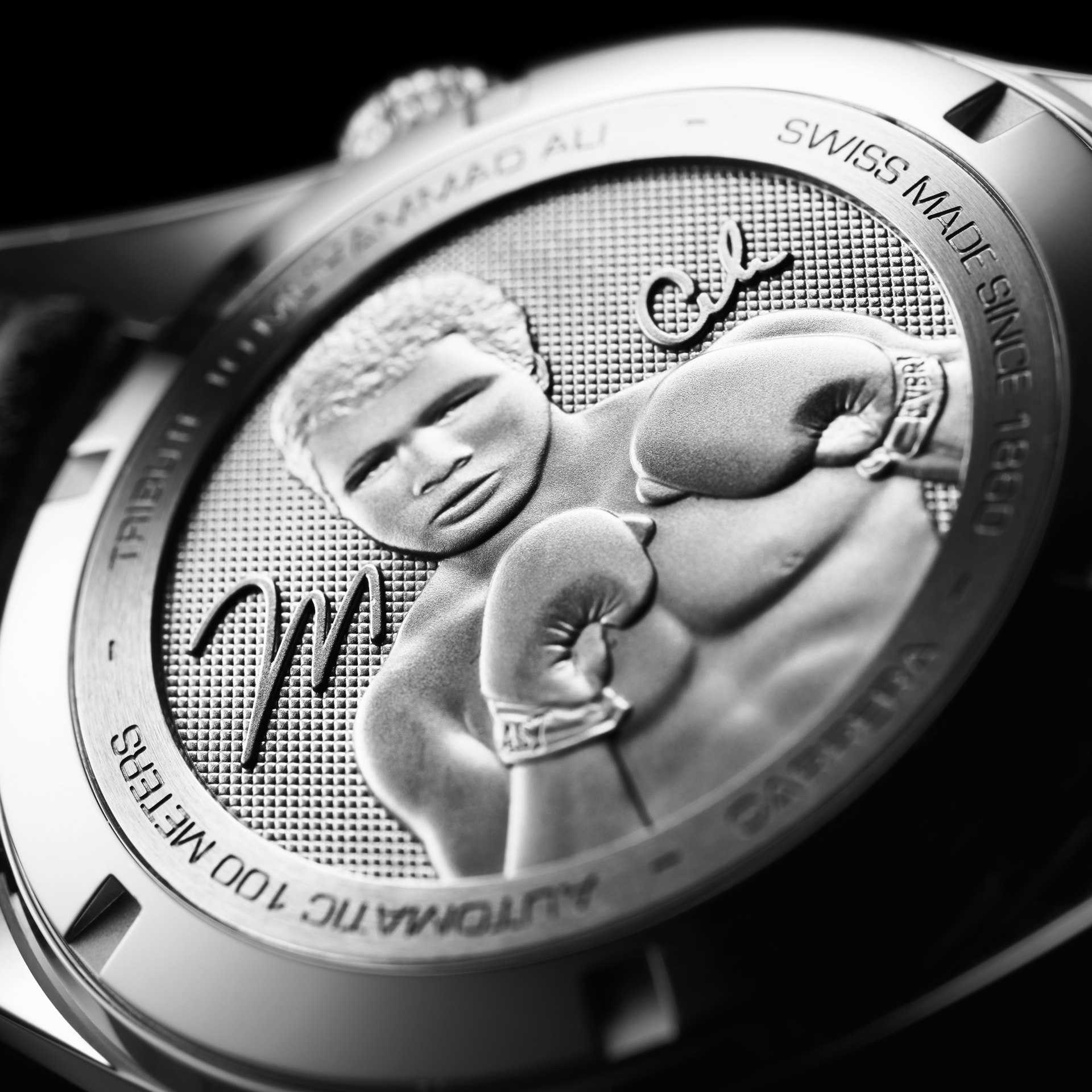 Okvir ure Calibre 5 je narejen iz stål, na hrbtni strani pa boste našli vgraviran Alijev portret z napisom “Tribute to Muhammad Ali”. Okvir krasi tudi safir, hvilken ne boste mogli opraskati in ne bo odbijal (sončne) svetlobe. Z uro se boste lahko potopili do 100 metrov globine.