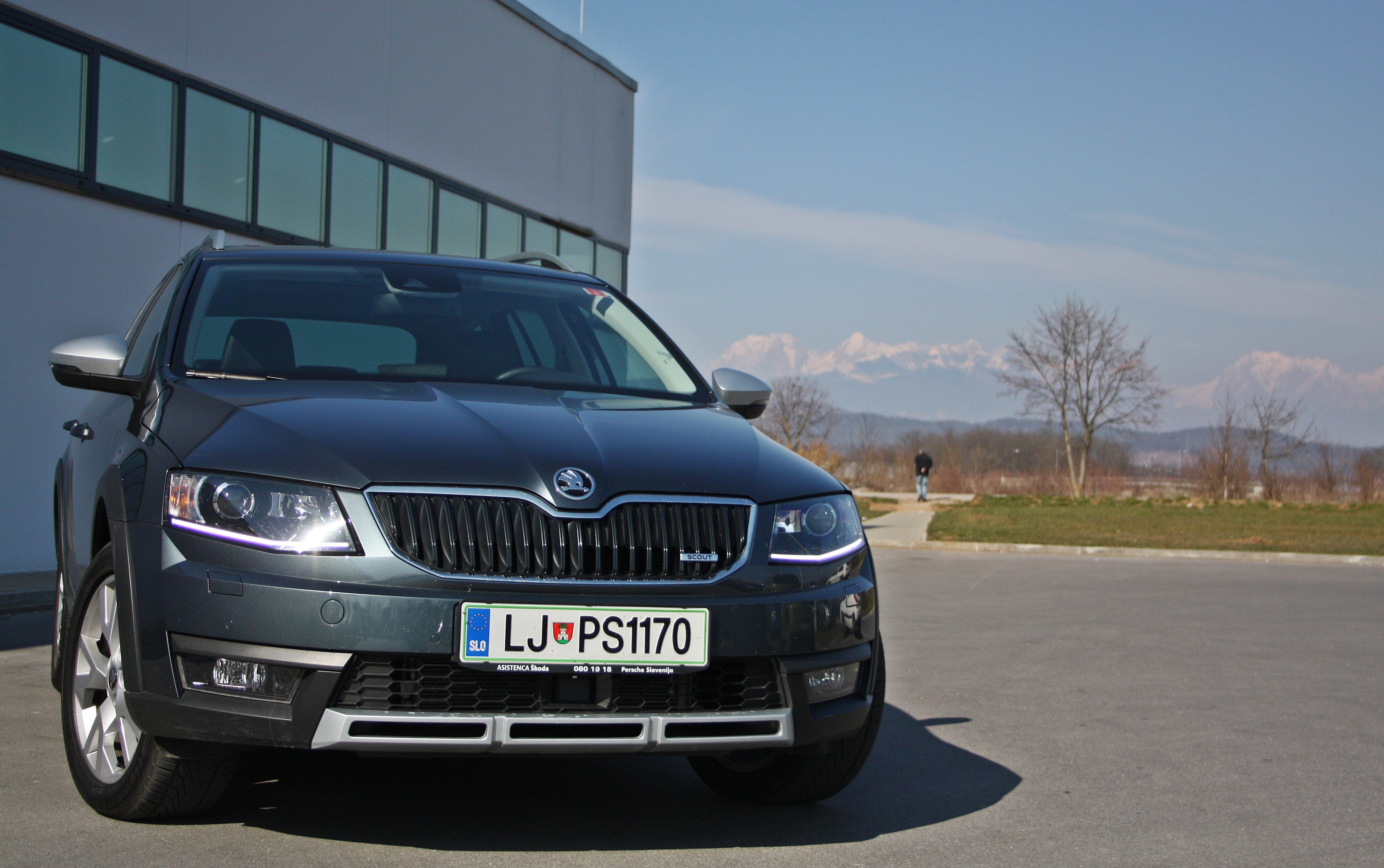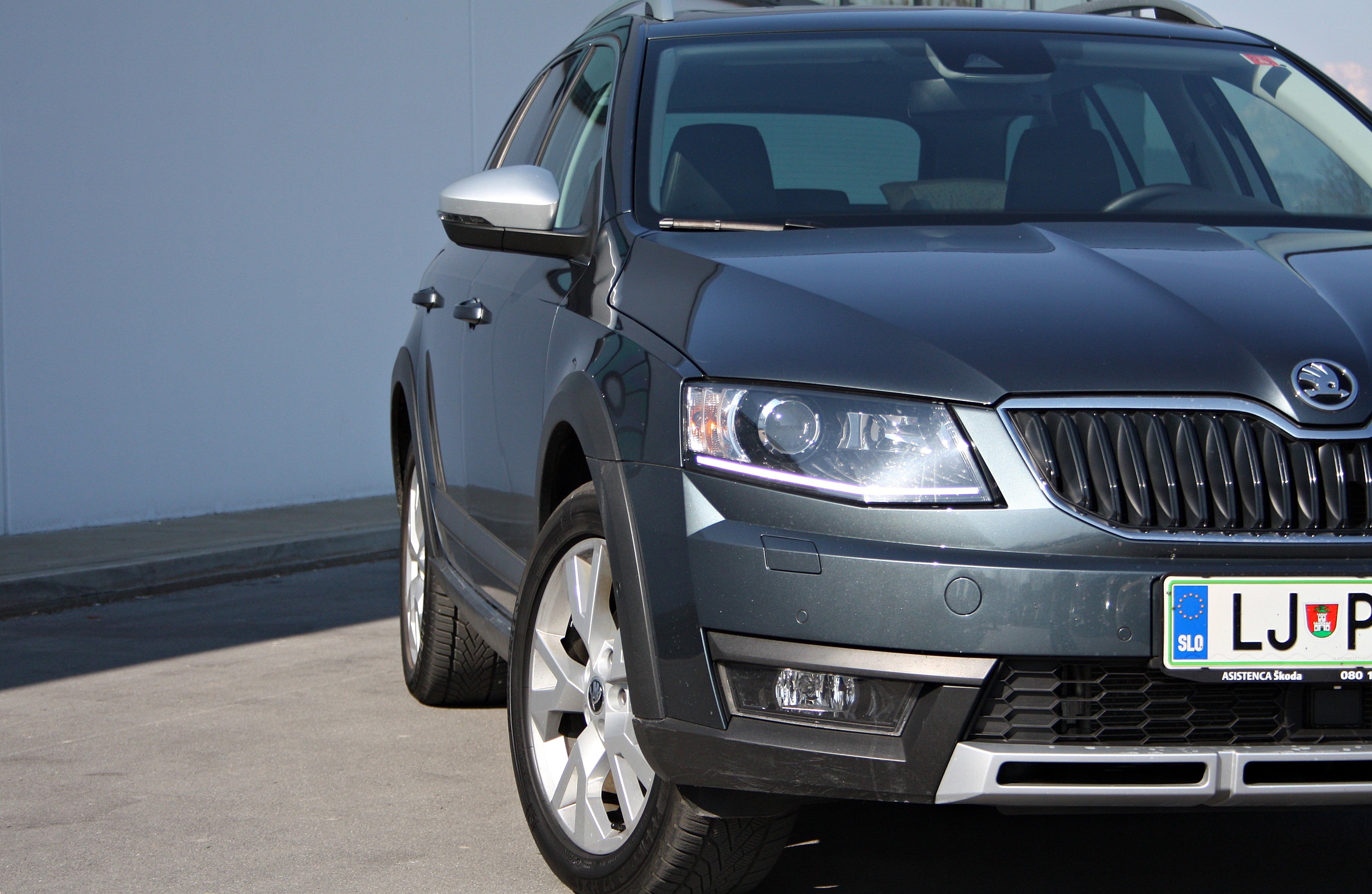 Škodo Octavio glede na zunanjo podobo, na čelu z na črno ozadje postavljenimi luči, ki že serielt svetijo v kombinaciji biksenonske in LED tehnike, hitro prepoznaš. Kroma se zdi ravno prav, vtis, ki ga kot celota scout pusti, ko zapelje mimo, pa je zelo dober. To pomeni tudi dober imidž, ki ga takšna vozila morajo imeti, saj ponavadi predstavljajo TOP ponudbo določenega modela in tudi znamke.