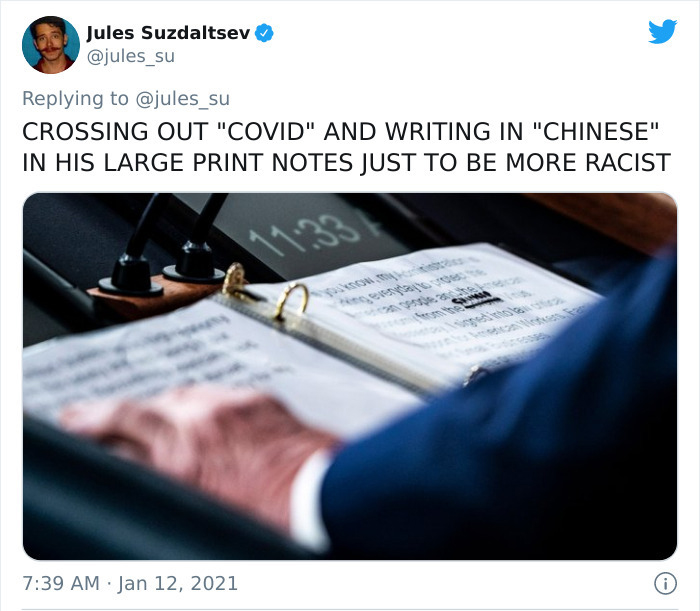 Ne glede na to, kaj se bo v teh dneh dogajalo z ameriških predsednikom Donaldom Trumpom (kakšen bo rezultat ustavne obtožbe), se njegov čas na položaju izteka. Da bi povzel njegov mandat, je Jules Suzdaltsev na Twitterju povabil ljudi, naj si vzamejo trenutek, da se spomnijo nekaterih “najbolj čudnih in neumnih” stvari, ki jih je Trump storil v svojem mandatu. Od metanja papirnatih brisač v množico po uničujočem orkanu do salutiranja severnokorejskemu general: Suzdaltsev je sestavil izpopolnjen seznam “dosežkov”.