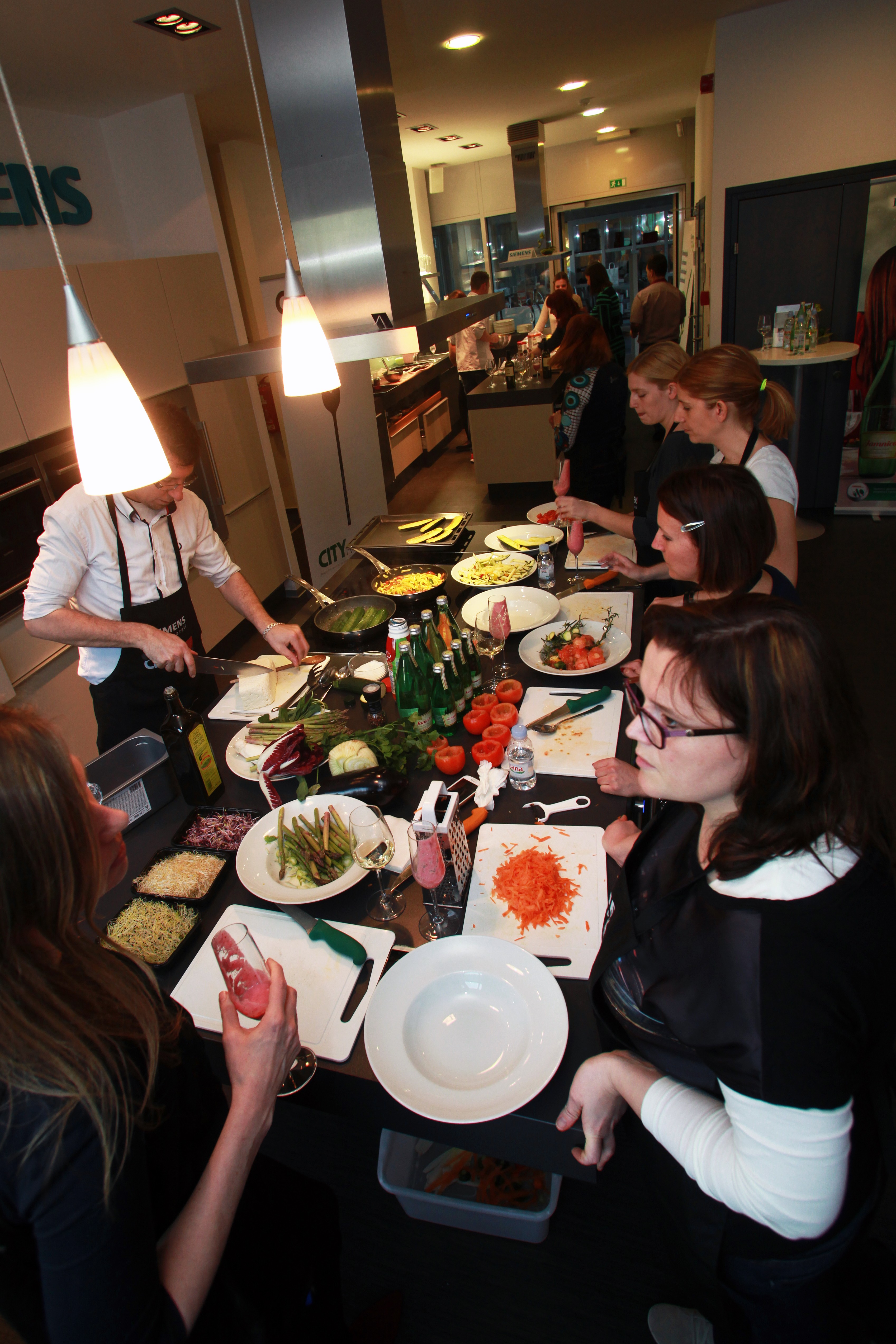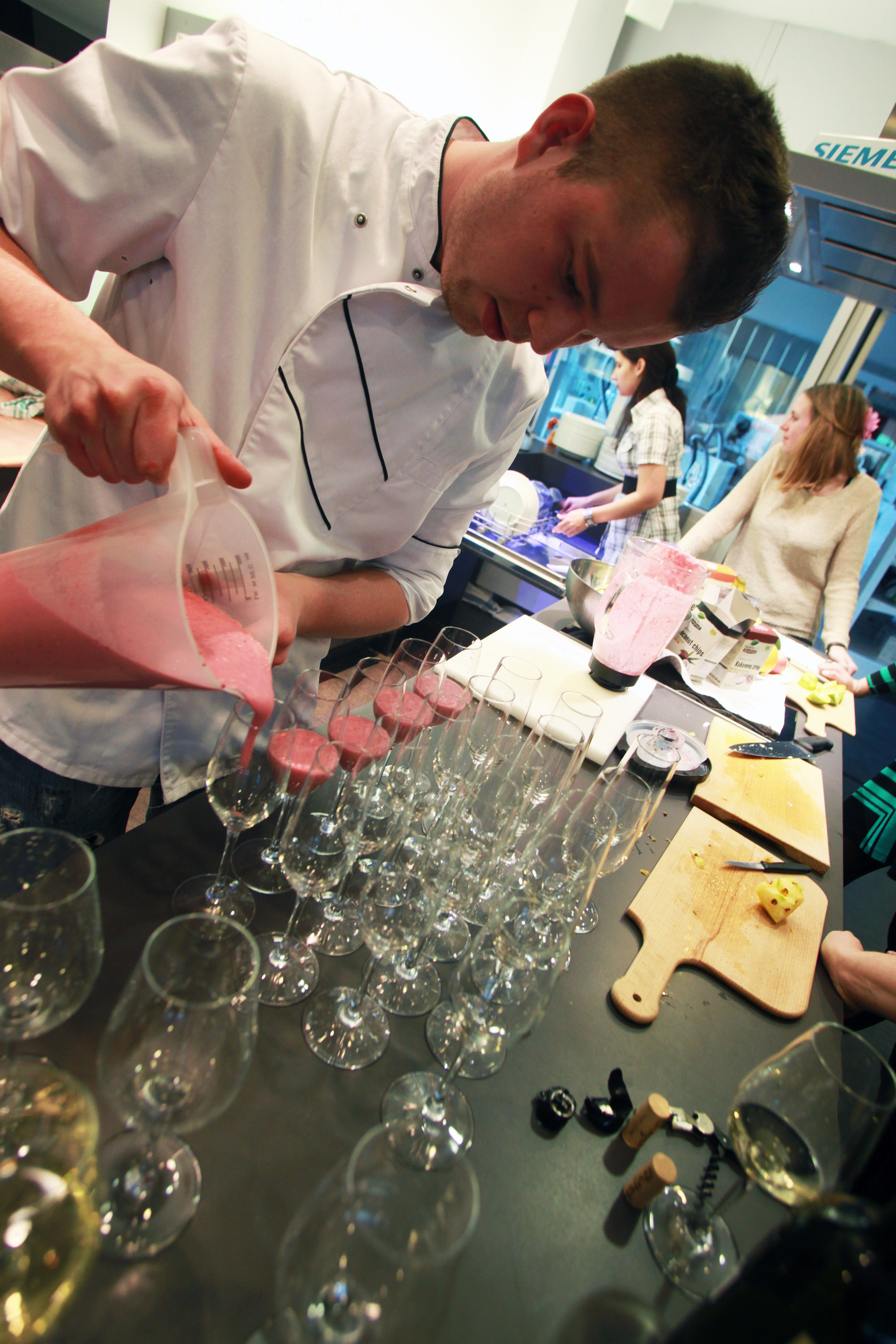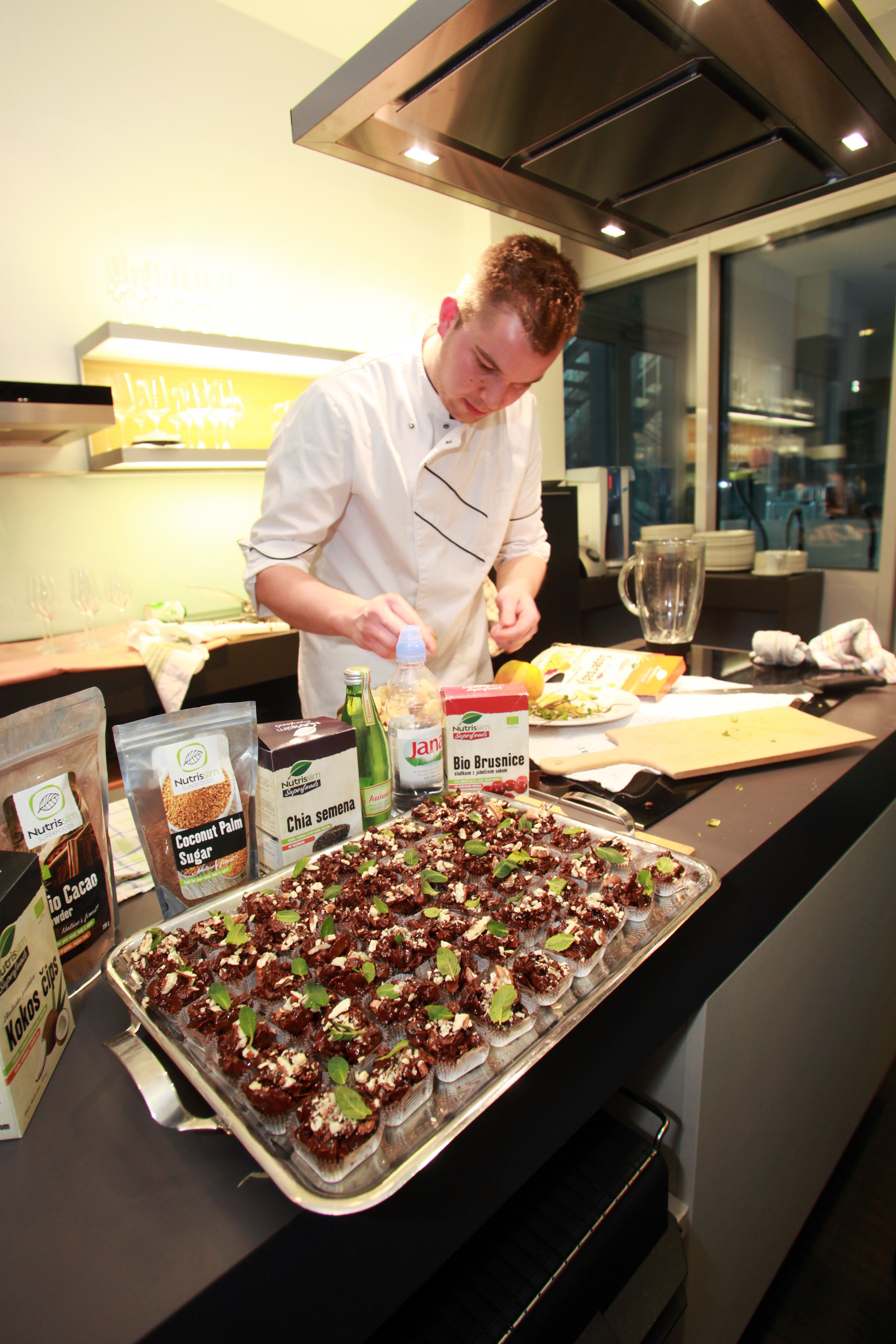 Na tokratni akademiji smo se pod budnim očesom kuharja Dragan Marjanoviča fra restauranten Kaval naučili, kako zdravo hrano pripraviti na hiter in zelo okusen način. Pripravljali smo bučkine čolničke, polnjene paradižnike z rikoto v pečici, brancina z zelenjavo, Dragan pa nas je naučil tudi, kako se očisti ribo brez nepotrebnega packanja. S slaščičarskim mojstrom Greg Rodet fra et konditori Lolita smo dokazali, da so tudi sladice lahko zdrave, le prave sestavine je potrebno izbrati. Pripravili smo smoothieje, “pozitivne” piškote in sladice, pripravljene s pomočjo super hrane Nutrislim. Med akademijo se je predstavil tudi vinar Piro.