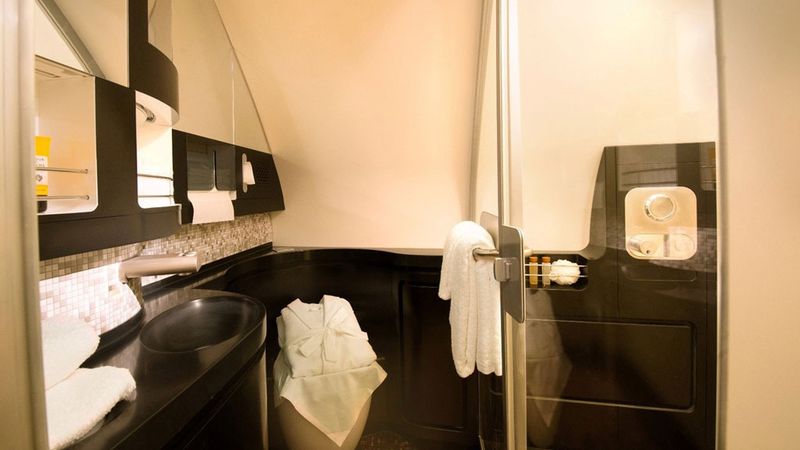 Er Residence verdt den heftige prislappen? Døm selv. Det er den eneste treroms private rom, som tilbys av et kommersielt flyselskap. Bostedstiltakene 125 kvadratmeter og inkluderer bad, dusj og plass til to gjester. Stuen har en 32-tommers LCD-TV, en skinnsofa og to spisebord, mens soverommet har en 27-tommers TV og en dobbeltseng. Ligger på alle fem flyene. Airbus A380 med 496 seter, som regnes som det største passasjerflyet i verden, men de er alle forskjellige fra hverandre.