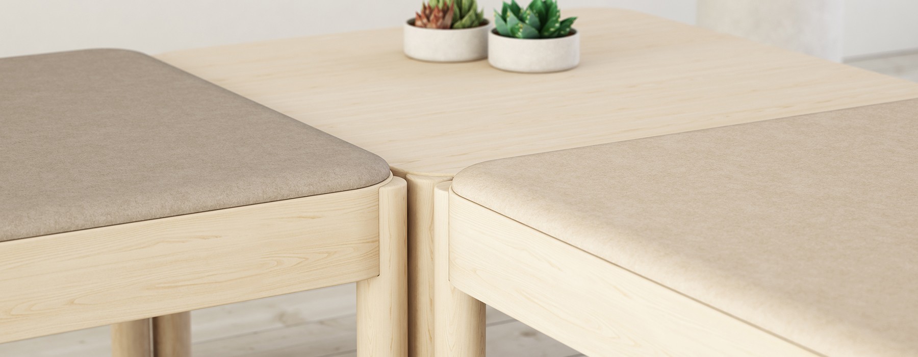 I prinsippet isolerer tre ikke lyden godt, men ikke Wakufuru-møblene designet av Johan Kauppi. Settet, som består av bord, benker og øyer, vil bringe ro til bordet selv i høylytte og overfylte restauranter.