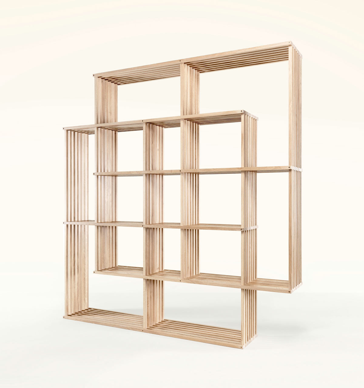 Designer Laurinda Marta fra selskapet WeWood har utformet en policy som satser på 100 % massiv eik. Materiale som er nødvendig for mange elementer bundet sammen med bevegelige elementer, kan fungere som en mekanisme for å muliggjøre transformasjon Bokhyller i flere former. Moduldesignet, som kan økes i både høyde og bredde, er laget av to blokker. Hver av disse blokkene er dannet av 48 trelameller, som fungerer sammen med messingskruer eller koblingselementer. Sistnevnte tillater bevegelse inn i en annen konfigurasjon.