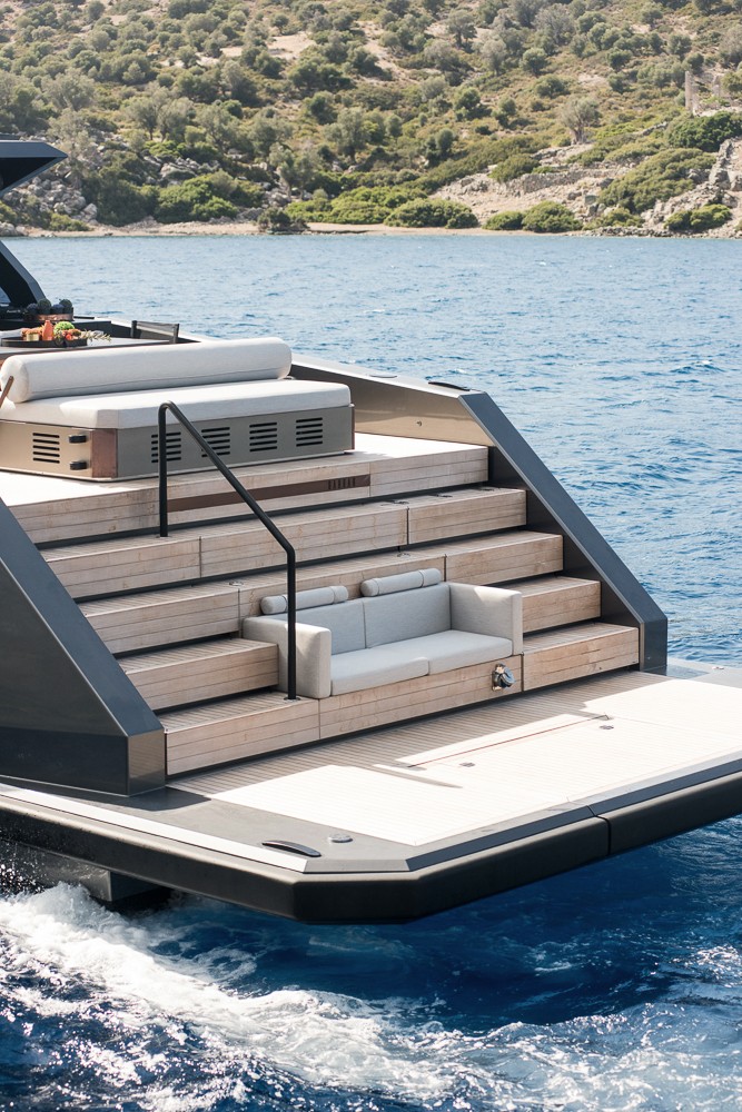 Dekkshytta er i form av et drivhus, foran er en større og flerbruksterrasse og terrassetrapp med innebygde seter som leder til vannet. De kjører yachten tre Volvo Penta-motorer, og karbonskroget hennes kan cruise i fart opptil 40 knop.