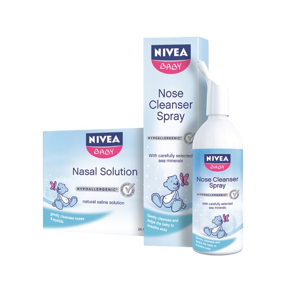 Eden najpogostejših vzrokov za moten spanec otroka so prav gotovo zamašeni nosni kanali. Otrok bo lažje dihal in bolje spal, če bomo poskrbeli, da bodo njegovi nosni kanali prehodni in občutljiva nosna sluznica dovolj navlažena. Prav v ta namen nam Nivea Baby priporoča stoodstotno fiziološko, sterilno solno raztopino, ki ne vsebuje dišav, barvil, konzervansov in dekongestivov ter je tako primerna za vsakodnevno uporabo. Nivea Baby sprej za čiščenje noska s fiziološko raztopino ima mikrorazpršilnik, ki je posebej razvit za čiščenje dojenčkovega noska. Formula z izvlečkom prečiščene, izotonične morske vode je idealna za naravno vsakodnevno higieno in nego dojenčka. Tako kot raztopina za čiščenje noska, tudi sprej čisti občutljiv dojenčkov nosek na kolikor je mogoče nežen način ter učinkovito olajša dihanje in preprečuje izsušitev noska. Oba izdelka sta primerna za otroke po tretjem mesecu starosti ter prav tako za mladostnike in odrasle, saj tudi pri njih čistita sluznico in pomagata odpraviti prekomerno izločanje  iz zamašenega nosu.