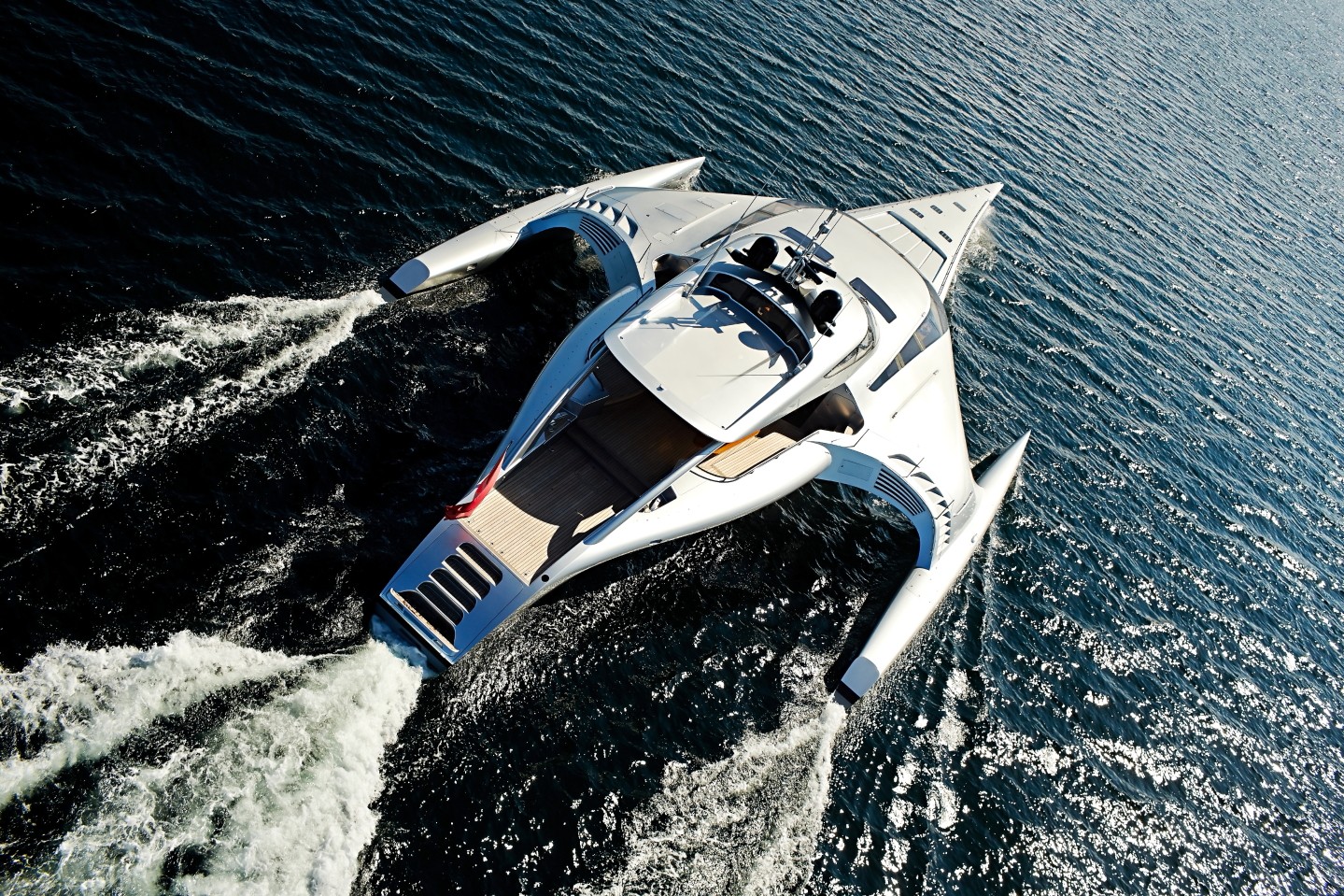 Adastra je nadvse prikladno ime za 42,5 metrski trimaran – plovilo, ki izgleda, kot da je pravkar pristalo iz vesolja. (»Ad astra« je latinski izraz, ki se prevaja kot »k zvezdam«).