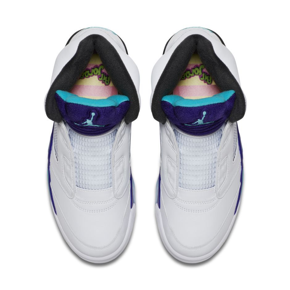 De makers versierden de binnenkant van de nieuwe sneakers met het opschrift "Air Jordan" En een combinatie van gele en roze strepen. Air Jordan V Fresh Prince heeft geen veters, en zal consumenten ermee overtuigen witte buitenkant met een bijlage paars, blauw, zwart En groente kleuren.