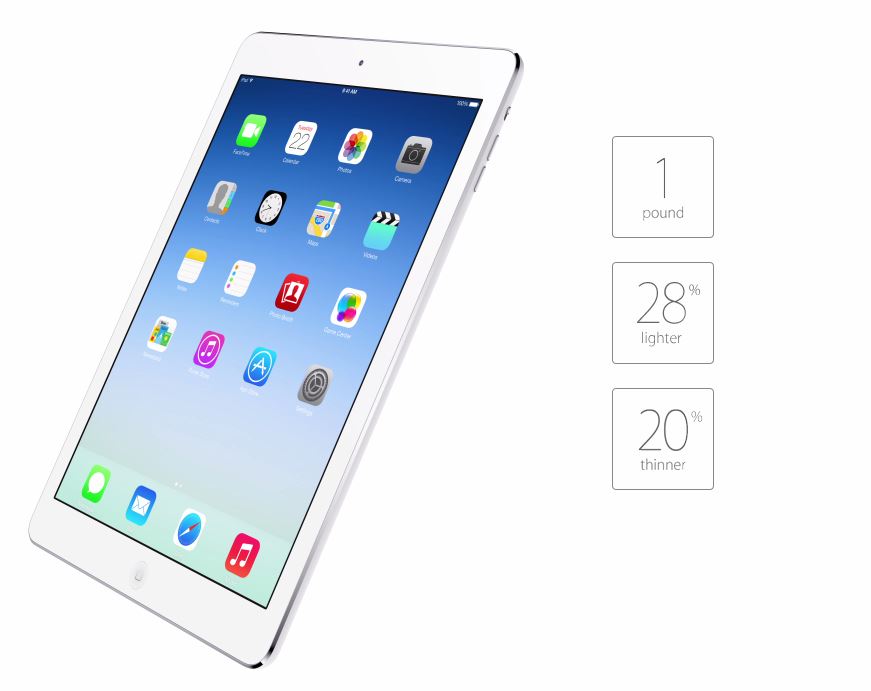 To ni običajno nadaljevanje nove generacije iPada, ki je sicer že peta po vrsti. Novi iPad Air je lažji, tanjši in kar je najpomembneje, močnejši ter hitrejši. Prav zato je prejel oznako Lucht, ki jo poznamo iz serije Applovih prenosnikov. Ponaša se z zmogljivim Retina zaslonom resolucije 2048 x 1536 točkovnih pik. Iz prejšnjih generacij vam bo poznana tudi FaceTime sprednja kamera in fotoaparat s 5 megapiksli. Pod aluminijasto zasnovo je na nov 64-bitni procesor A7, kakršnega smo prvič spoznali prejšnji mesec ob lansiranju novega iPhona 5S. iPad bo na voljo v štirih različicah na podlagi pomnilnika: 16GB, 32 GB, 64 GB in 128 GB. Pri barvi boste izbirali med belo/srebrno in sivo/črno kombinacijo. V ZDA se bo cena iPad Aira gibala od 500 ameriških dolarjev naprej. Vse to, že čez dober teden dni.