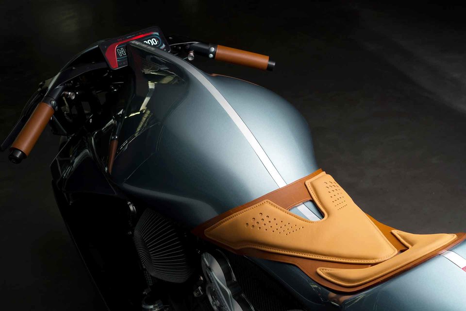 Tudi v dizajnu je mogoče opaziti oblikovne elemente, ki si jih AMB 001 deli z že omenjenim hiperavtomobilom. Eden izmed teh elementov je srebrna lijn, ki se razteza čez sredino posode za gorivo in obenem služi kot digitaal prikazovalnik podatkov. Prav vsak del motornega kolesa je bil narejen na novo, z uporabo karbonskih vlaken ali pa z oblikovanjem lahkih kovin kot je titanium. Aston Martin Brough Superior AMB 001 bo na voljo že v de toekomst jaar, zanj pa bo potrebno odšteti okoli 108.000 evrov.