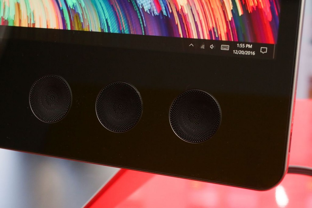 De nieuwe Dell XPS 27 wel uitgerust met maar liefst 10 luidsprekers. Zes van hen staren naar de gebruiker (vier middentonenluidsprekers en twee woofers), zijn er nog twee die het geluid naar beneden loslaten en nog twee tegen meerprijs passieve radiatoren. Dell belooft een computer met het beste geluid ter wereld. Het is versierd met InfinityEdge 4K-scherm (3840 x 2160), wat kan gevoelig voor aanraking (deze versie is iets zwaarder en weegt 17 kilogram vergeleken met 13 kg). Voor de stand kun je een scherm hebben, vergelijkbaar met dat van Microsoft Oppervlaktestudio, plaatsen we hem in een praktisch hellende positie (60 graden helling). We hebben de volgende interfaces vermeld: USB 3.0, USB-C, HDMI, DisplayPort, Thunderbolt 3 en Gigabit-Ethernet. Er is ook een audio-aansluiting en een SD-kaartlezer. Het is een geval uit aluminium, waaronder hij zich verbergt 32/64 GB DDR4-RAM- A. Je kunt kiezen tussen 1 of 2 TB harde schijf mee 32 GB M.2 SSD. Onze ingenieurs gaven hem een Intel HD Graphics 530 of AMD R9 M485X. Het wordt aangedreven door een Intel Core i5-6400-processor of Kern i7-6700. Je zult moeten uitkijken naar het basismodel 1450 euro.