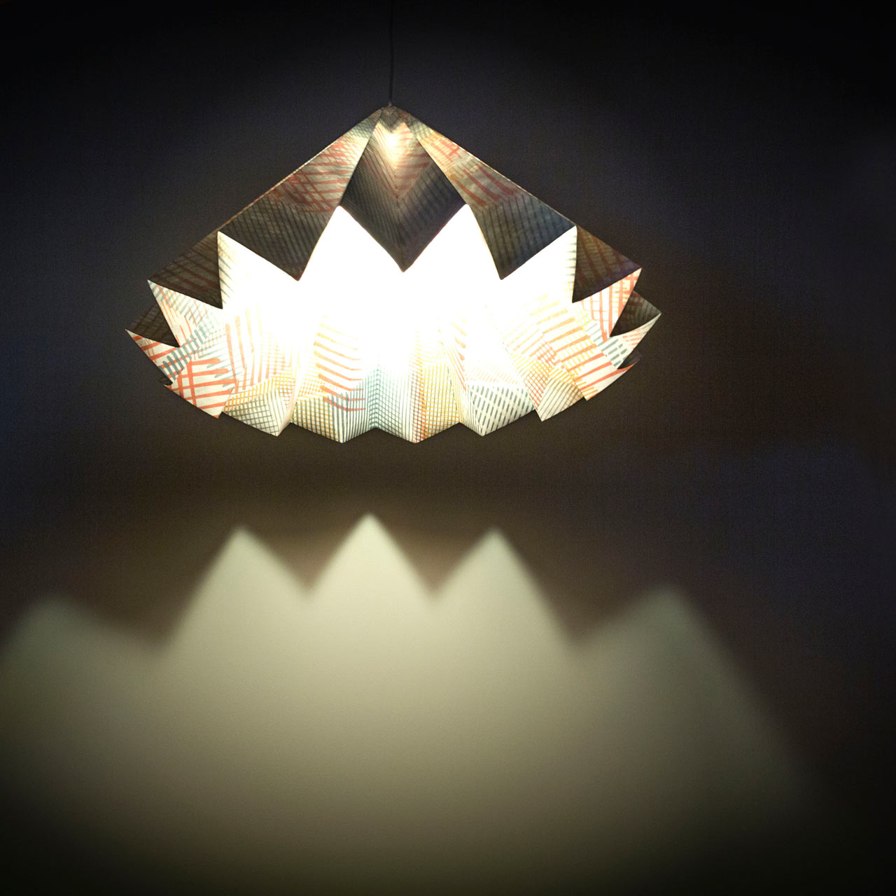 De waaiervormige lamp "Swing Suspension Lamp" is het werk van twee ontwerpstudio's. Bij Metrocuadro Design wilden ze een lamp maken die er overdag en 's nachts goed uit zou zien, dus nodigden ze de studio All The Fruits uit om deel te nemen, die met zijn ontwerp dat 's nachts echt tot leven komt, de toch al uitzonderlijke esthetiek zeker opwaardeerde licht.