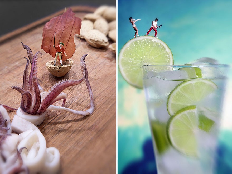 Za nekatere je ustvarjanje v kuhinji nekaj vsakdanjega in avtomatičnega. Kdo drug je nad kulinaričnim udejstvovanjem tako zelo navdušen, da v kuhanju najde priložnost za umetniško ustvarjanje. Igranje s hrano je tokrat doživelo nove razsežnosti, saj so sočni sadeži, hrustljava zelenjava in slastne testenine navdušile brazilskega umetnika Williama Kassa v tolikšni meri, da je iz njih ustvaril pravcati nadrealni svet. V seriji z naslovom “Minimize-Food” je namreč miniaturne človeške figurice postavil v svet, ki ga je sestavil iz hrane. Sadje, zelenjava, testenine, sladoled in še kaj v seriji fotografij sestavljajo odlično kuliso in prav posebno scenografijo. Še en dokaz, da je z nekaj domišljije možno vse!