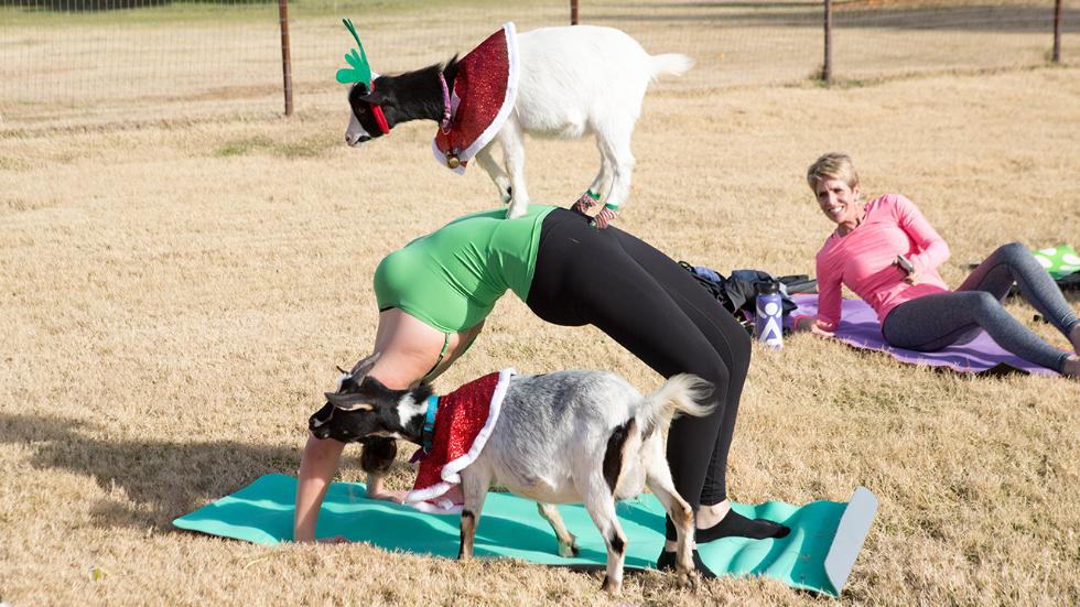 Dit soort oefening verbetert de gezondheid, flexibiliteit en vermindert, nog meer dan klassieke yoga, het stressniveauGeiten tijdens het sporten ze lopen vrij rond tussen de mensen en klimmen op hun ruggen en buiken.