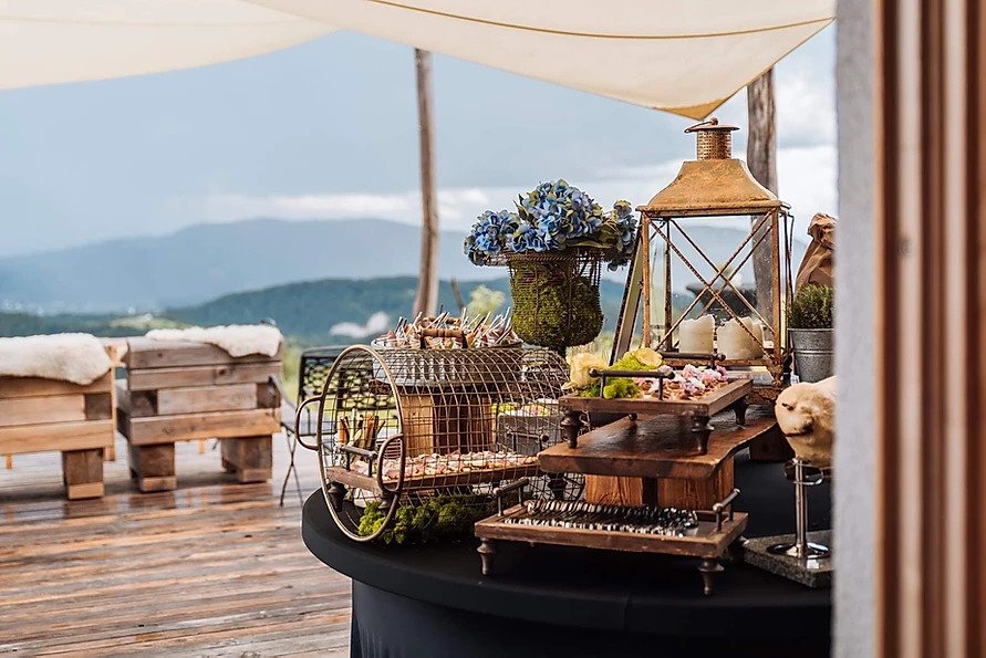 Plahutniks appartement is een prachtige plek waar bruiloften, feesten en jubilea een nog magischere gebeurtenis worden. Een prachtig houten gebouw met veel natuurlijk licht maakt indruk op zelfs de meest veeleisende gasten. Minimalistische meubels en het gebruik van natuurlijke materialen geven een bijzonder gevoel van huiselijkheid en eenvoud, terwijl het grote terras een prachtig uitzicht biedt op de omliggende heuvels, bossen en weilanden en tegelijkertijd buitenfeesten mogelijk maakt.