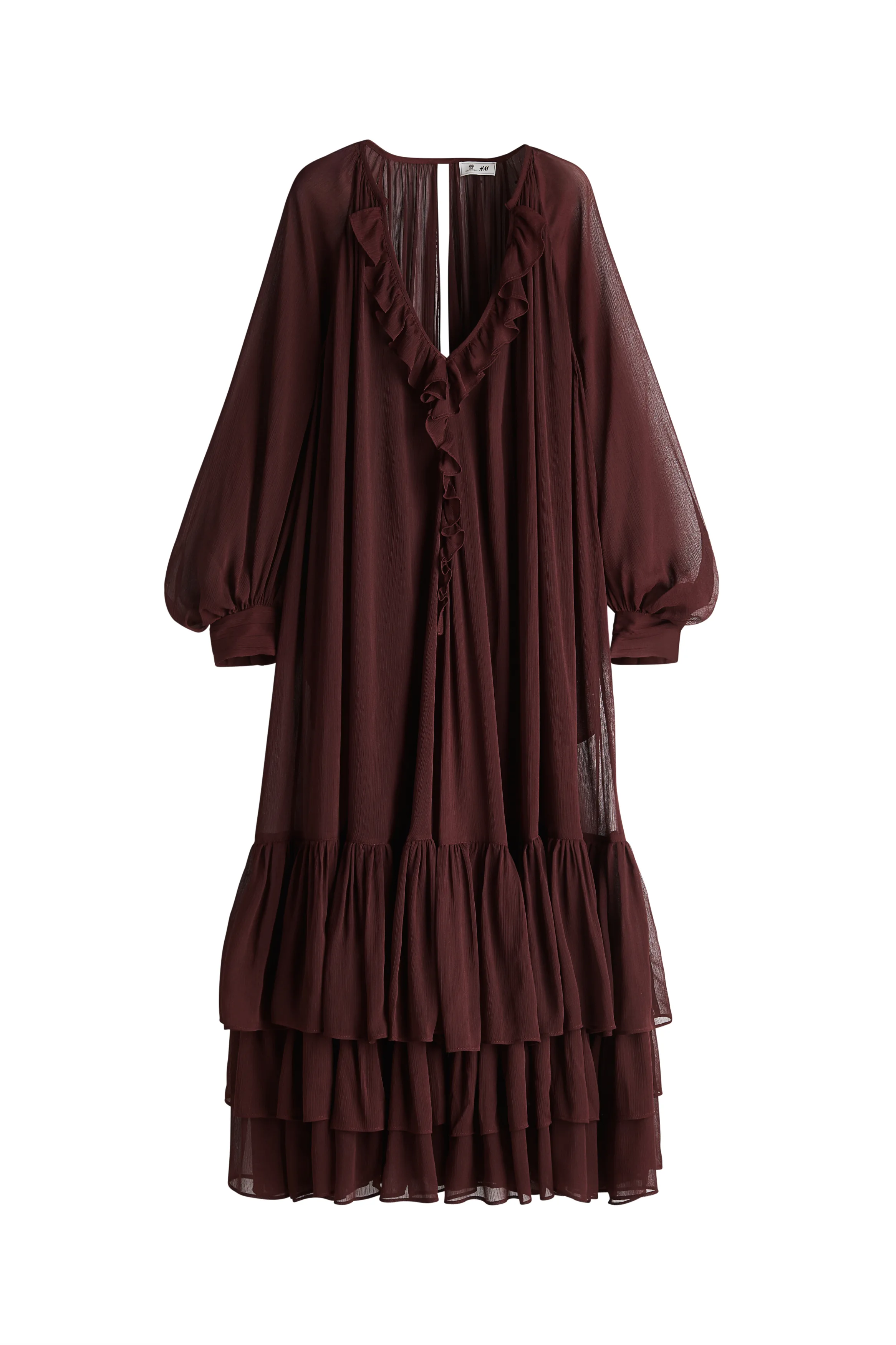 - Lange golvende bordeauxrode jurk met hoge kraag en ruches – perfect voor een cocktailparty in de avond.