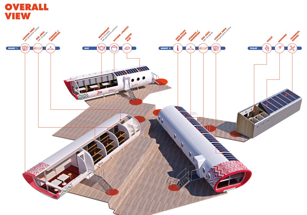 Het gebouw is ontworpen door een Italiaanse architectengroep LEAPfabriek, gespecialiseerd in ontwerp en architectuur van gebouwen in extreme omstandigheden. Op hoogte 4000 meter Zo bouwden ze een hotel in drie buizen (de gedeelde slaapkamers voor 49 gasten en de lounge bevinden zich in twee buizen, terwijl de derde het restaurant en de personeelsverblijven bevat, terwijl de badkamers zich in een ontwrichte kubus bevinden). De architecten integreerden verschillende technologieën in het project, vooral op het gebied van energiebesparing en duurzame en gerecyclede bronnen. Het hotel, dat in september werd geopend, is het eerste in een reeks projecten die de toeristische potentiële locatie nieuw leven zullen inblazen.
