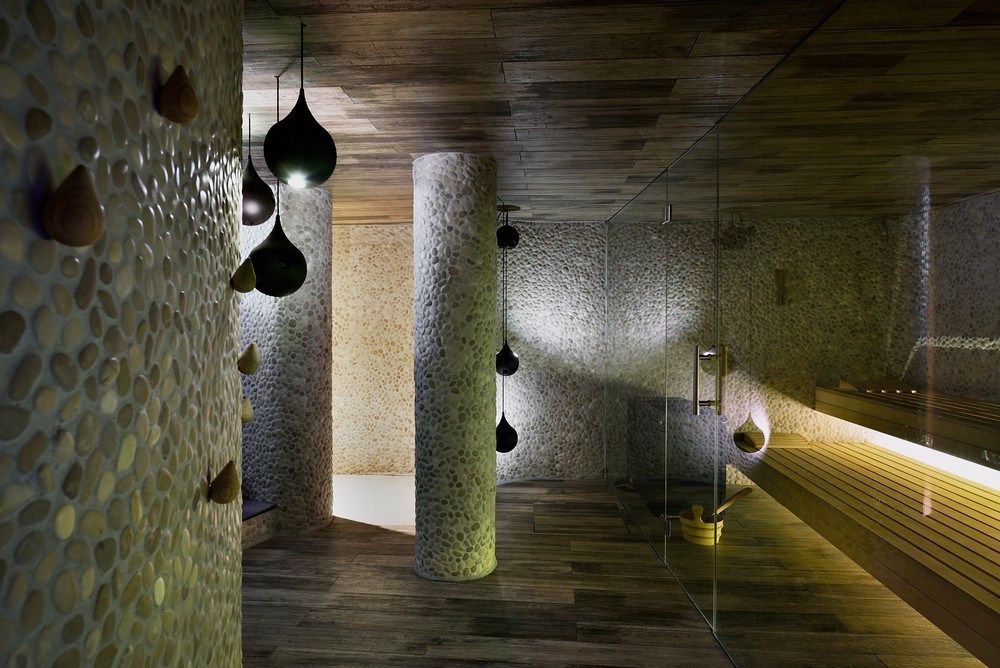 Stene iz prodnikov delijo teraso za sončenje na tri dele: na del s sauna, op velneški prostor en verder vhodni del. Pročelje med razdelki je v celoti iz stekla. Celoten hotel je bil zasnovan z uporabo lokalnih materialov.