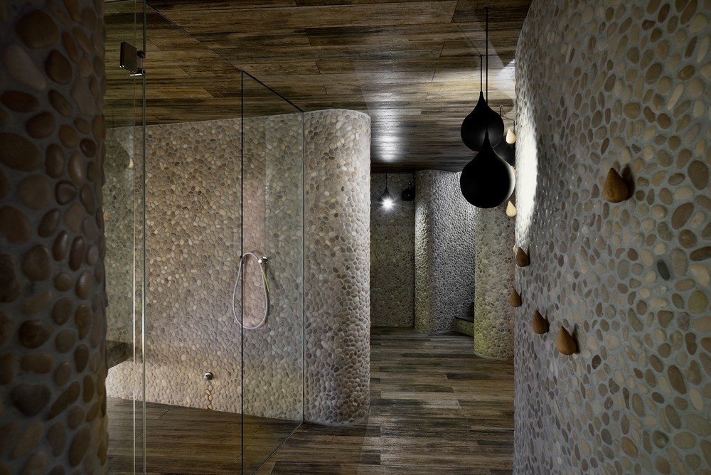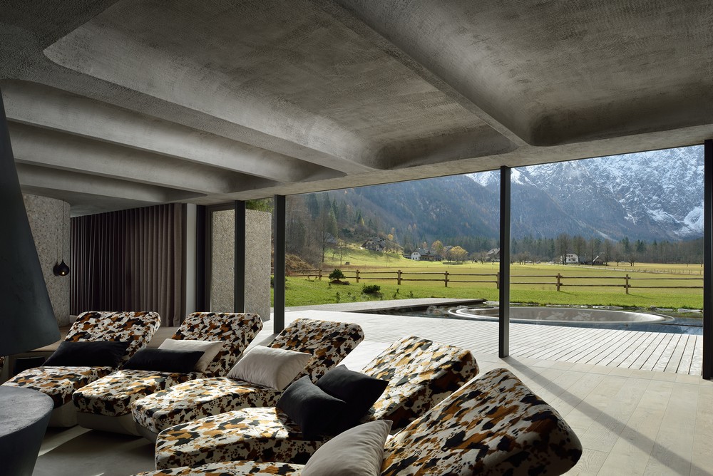 Hotelski velnes sestoji iz štirih programsko različnih sklopov, ki so razpršeni po prostoru, a hkrati z elegantnimi prehodi povezani v celoto. Osrednji centralni prostor definirata velika ogrevana masažna kad ter prostor z udobnimi počivalniki. Veliko panoramsko okno, ki se vije preko celotne stene, omogoča dobro naravno osvetlitev in s pomočjo premišljene ambientalne osvetlitve obiskovalca sprosti in umiri, njegov pogled pa nežno popelje preko travnika proti alpskim vršacem z Ojstrico na čelu