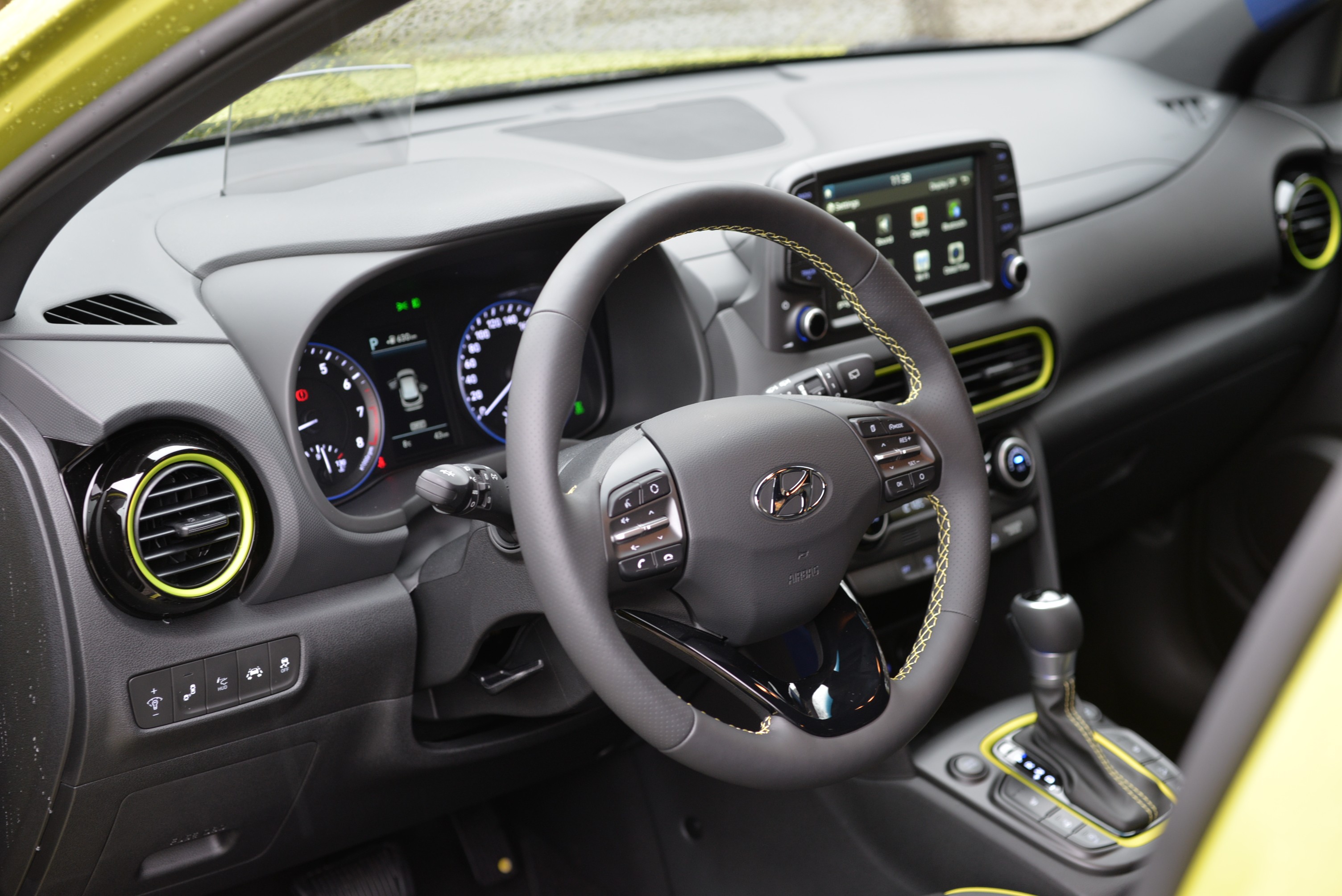 De Hyundai Kona is niet alleen iets bijzonders qua design, heeft ook een heleboel hulpsystemen. Daarmee is de Kona ook een stap voor op de concurrentie, want hij waarschuwt ons voor een botsing en remt zelf om een botsing te voorkomen. Wanneer u achteruitrijdt, houdt het systeem het verkeer achter u in de gaten en waarschuwt het u voor naderend verkeer. Aanbiedingen draadloos opladen van smartphones, die via een kabel kan worden aangesloten Apple CarPlay En Android-auto'swanneer het in Slovenië beschikbaar zal zijn. De Hyundai Kona heeft zelfs de verwarming En stoelventilatie, die elementen zijn van hogere prijsklassen. Opvallend is dat de kleur van de stiksels in het interieur van de auto altijd overeenkomt met de kleur van de veiligheidsgordels.