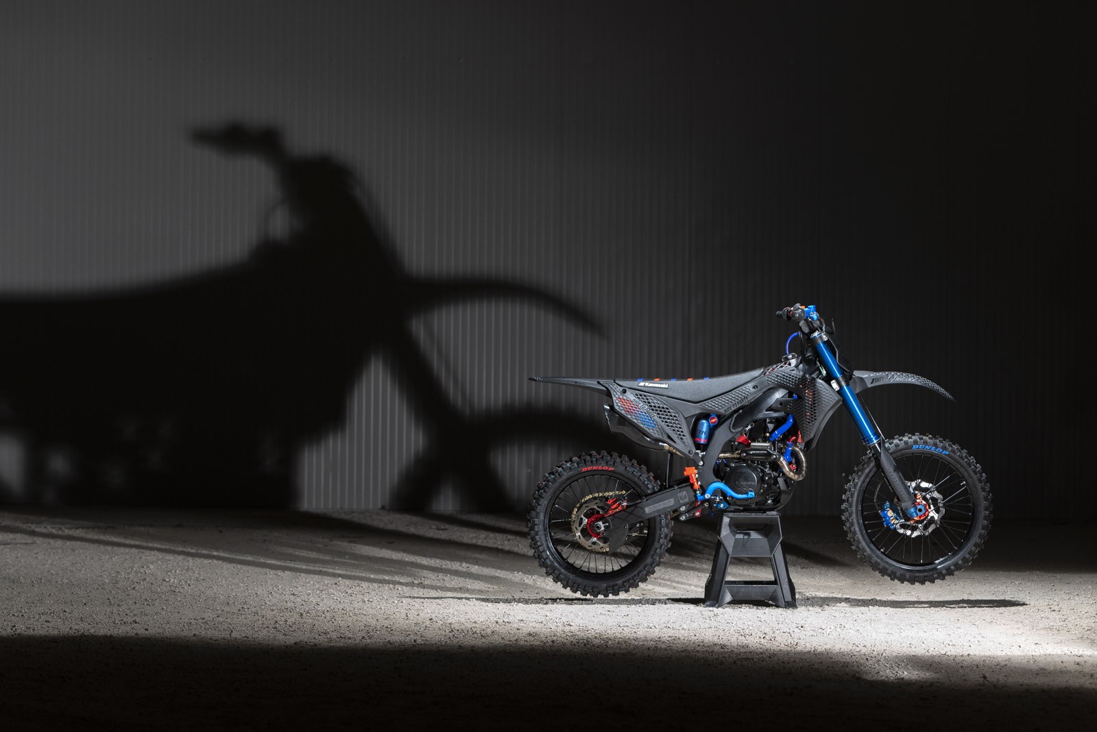 Wanneer de verbeeldingskracht en de 3D-printtechnologie van voormalig pro-motorcrosser Alvaro Del Farra samenkomen, ontstaat de Kawasaki KX 450 3D Core van Del Farra Motocross Beast - de 'kern' heeft blauw en rood lakwerk om de slagaders en aorta's van het 3D-geprinte beest weer te geven .