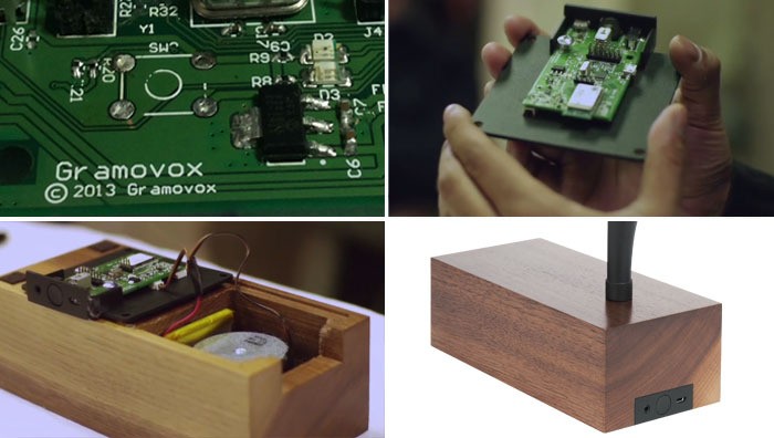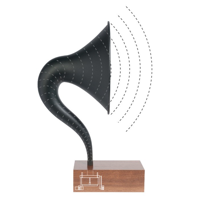 Inovativna naprava je svoje temelje našla v slavnem gramofonu Magnavox R3 iz leta 1920. Sodobna različica prinaša vintage zvok prek Bluetooth povezovanja, ki sega do 10 metrov daleč. Replika kovinskega roga, narejena s pomočjo 3D printerja, je zapeljivo nameščena na minimalistični podstavek iz orehovega ali javorjevega lesa, v katerem se skriva po meri narejeno tiskano vezje z Bluetooth 3.0. V sodelovanju z indie glasbeno skupino Fort Frances so ustvarjalci pripravili tudi prvi demo zvočni posnetek. Gramovox tako vzbuja nostalgijo poslušanja rahlo hreščečih melodij v toplini skupinskega druženja.