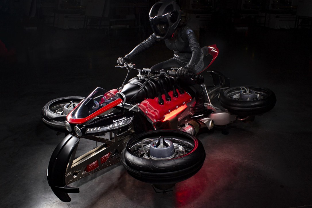 Lazareth La Moto Volante 496 is 's werelds eerste motorfiets die kan worden omgebouwd tot quadcopterJa, je leest het goed, een motorfiets die een drone wordt! Het ontwerp blijft onmiskenbaar Lazareth, maar de technologie die de motorfiets aandrijft, is iets heel anders. De basisaandrijving is elektrische motor, met 100 kilometer autonomie, en ze nemen deel aan de vlucht JetCat-turbines, die eigenlijk deel uitmaken van elk wiel. Deze bewegen naar buiten en in een horizontale positie, waardoor de motorfiets 10 minuten vliegen of zweven. Het totale vermogen van de turbines is evenveel als 1.300 pkdie kerosine gebruiken om 2.800 Newton Met een simpele druk op de knop keren de turbines terug naar hun oorspronkelijke positie en is de motor weer klaar voor gebruik. 5 LMV 496 eenheden, die elk ongeveer € 100,- kosten 500.000 euro.
