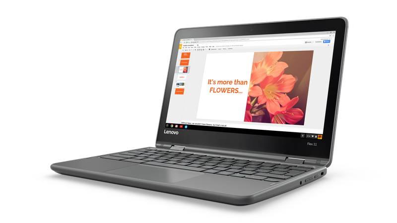 Lenovo Flex 11 Chromebook je na padce in vodo odporen prenosnik 2-v-1 z 11,6-palčnim IPS-zaslonom na dotik ločljivosti 1366 x 768 slikovnih točk. Poganja ga štirijedrni procesor ARM-frekvence 2.1 GHz. Izdelan je bil z mislijo na aplikacije za naprave Android, zato pričakovano poganja aplikacije za ta mobilni operacijski sistem. Stavi predvsem na hitro možnost preklaplja med prenosnikom in tabličnim računalnikom. Od ostale strojne opreme velja omeniti še 4GB sistemskega pomnilnika in delovni pomnilnik z zmogljivostjo 32 GB, ki ga je moč razširiti s pomnilniško kartico microSD in ključkom USB.