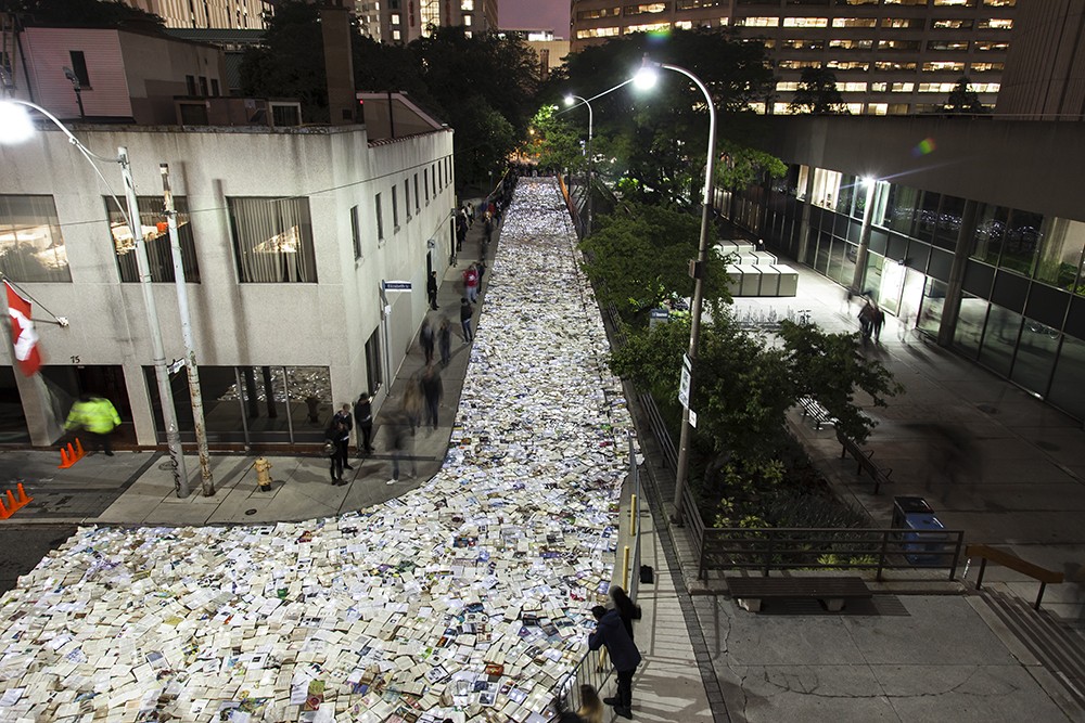 Anonieme kunstgroep Luzinterruptus is een straat in een Canadese stad Toronto bedekt met boeken.