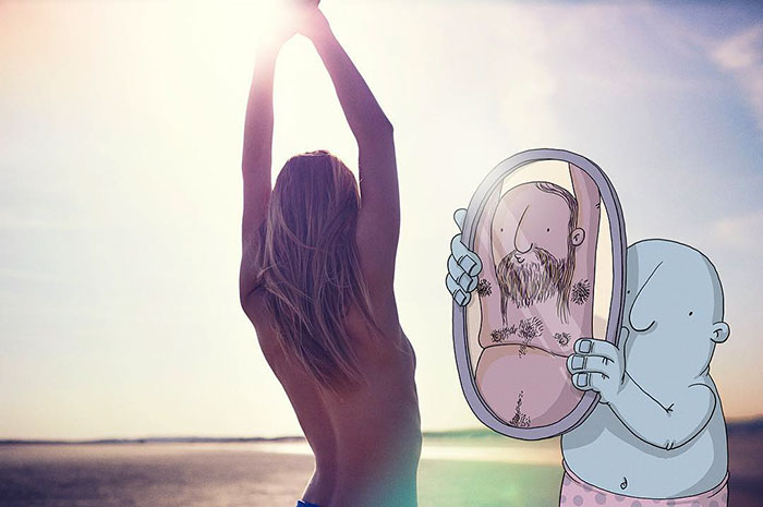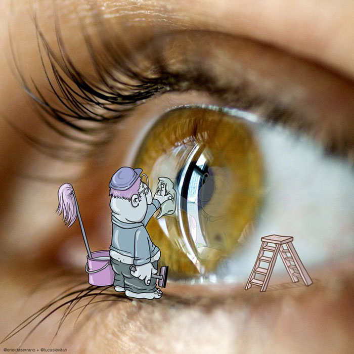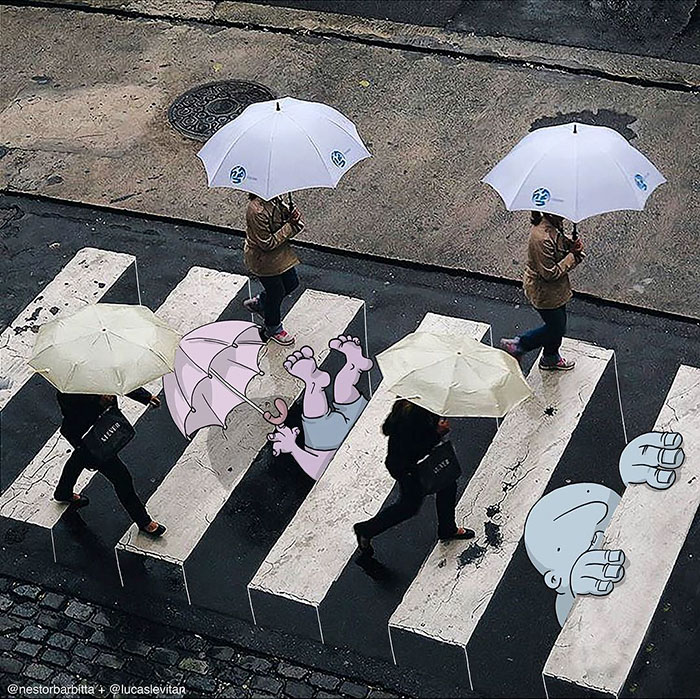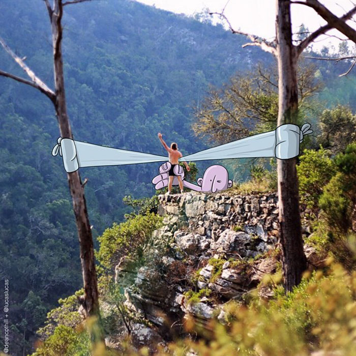 Lucas Levitan, een zelfbenoemde 'fotobedrieger', is een Braziliaanse kunstenaar die twee werelden combineert. Realiteit en karikaturen. Als canvas voor zijn digitale illustraties gebruikt hij foto's van vreemden die op Instagram zijn geplaatst, waaraan hij geïllustreerde karakters toevoegt die de scènes een nieuwe betekenis geven.