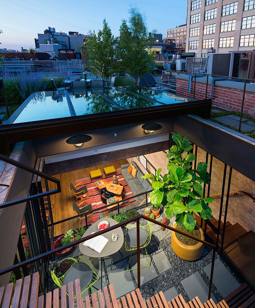 Manhattan's Tribeca is een van de populairste wijken van New York en trekt iedereen aan die graag in ruime appartementen wil wonen die in wezen omgebouwde pakhuizen zijn. Het tot appartement verbouwde voormalige kaviaarpakhuis, te bezichtigen in de galerij, maakt indruk met zijn luchtigheid, moderne interieur en verlaagd binnenterras. De innovatieve renovatie, waarbij de architecten een stukje van de groene buitenkant en een overvloed aan natuurlijk licht naar het interieur van het appartement brachten, is bedacht door een New Yorks architectenbureau Andrew Franz Architect PLLC.