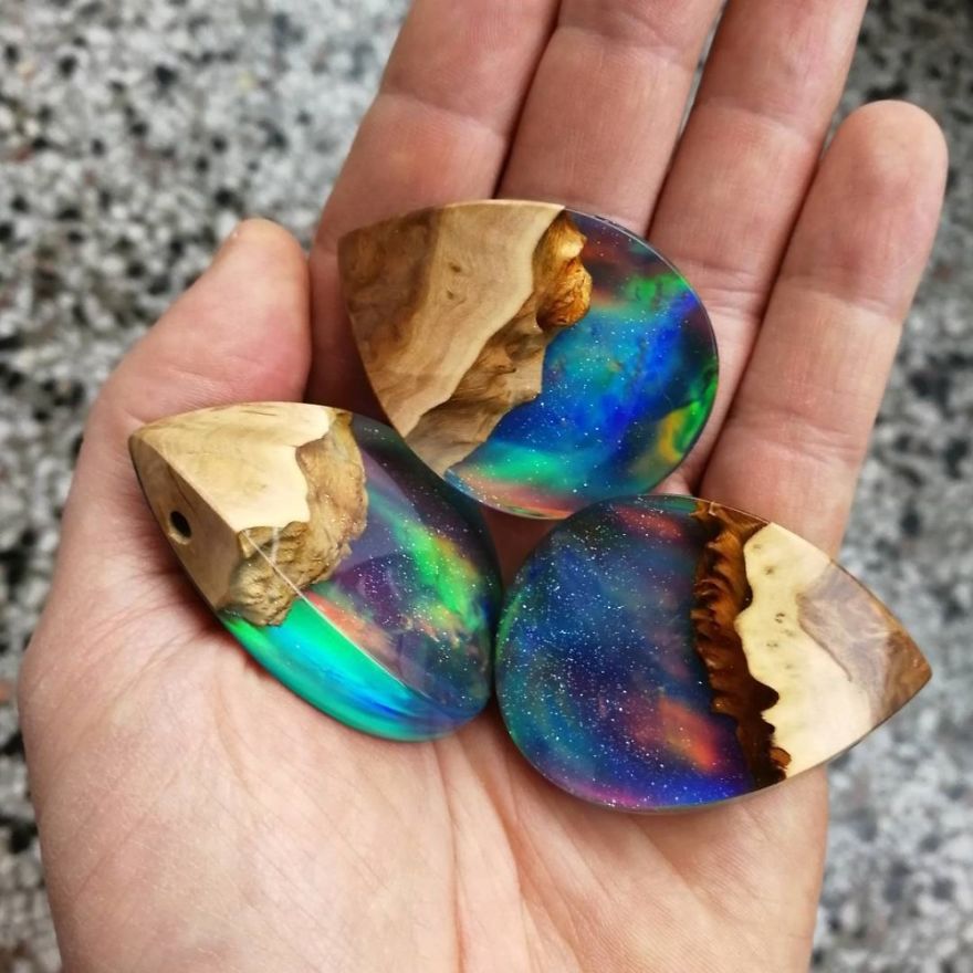 Naam sieraden Hout allemaal goed is in combinatie ontstaan hout en hars, maar de kunstenaar koos voor zijn werk omvatten ook opalen. En zo zijn ze ontstaan originele sieradenontwerpen, welke ze lijken op miniatuurwerelden met heuvels, sterrenstelsels En Noorderlicht. In de fotogalerij wordt duidelijk welke er wordt over magie gesproken.