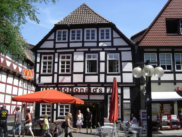 McDonald’s vsako sekundo proda 75 hamburgerjev, njegov uspeh pa ni samo rezultat hrane in magičnega oglaševanja, pač pa tudi izgleda restavracij. Ker so te razpršene po celem svetu in so si kulture tako zelo različne- vse pa morajo jesti- se, kljub uniformiranemu nastopu pri interierju, rad igra z zunanjostjo. Seveda logotip, ki je za Coca-Colo drugi najbolj prepoznaven simbol na svetu, ostaja nedotaknjen, a ima pogosto različne arhitekturne gostitelje.