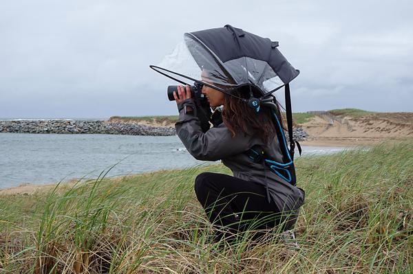 Foto's maken in de regen is niet het gemakkelijkste ter wereld. Als je je fotoapparatuur wilt beschermen, moet je meestal een paraplu gebruiken, wat veel beperkingen met zich meebrengt. U kunt dit probleem oplossen met Nubrella's innovatieve no-hold paraplu. Hij bedekt het bovenlichaam, is licht en wordt op de schouder gedragen, waardoor we beide handen vrij hebben.