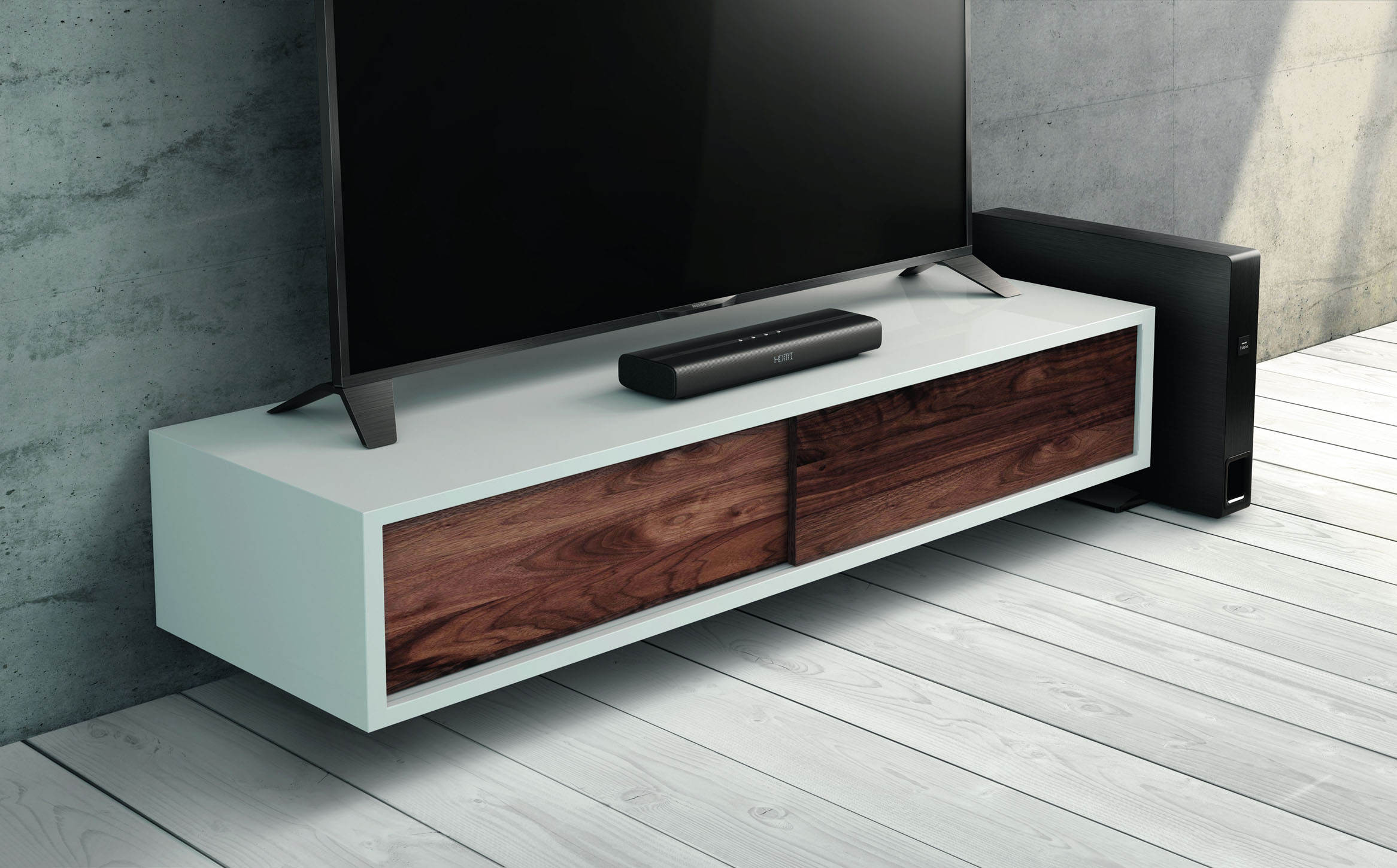 Omdat het zo is compacte afmetingen (hij is slechts 41 centimeter breed), ook geschikt voor kleinere kamers. Door zijn vorm past hij bijna bij alle tv-formaten een flinterdun toestel met subwoofers en kan vrijwel overal in de woonkamer geplaatst worden.