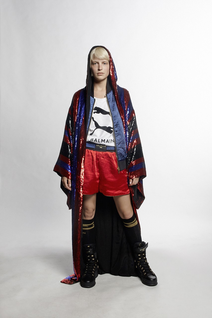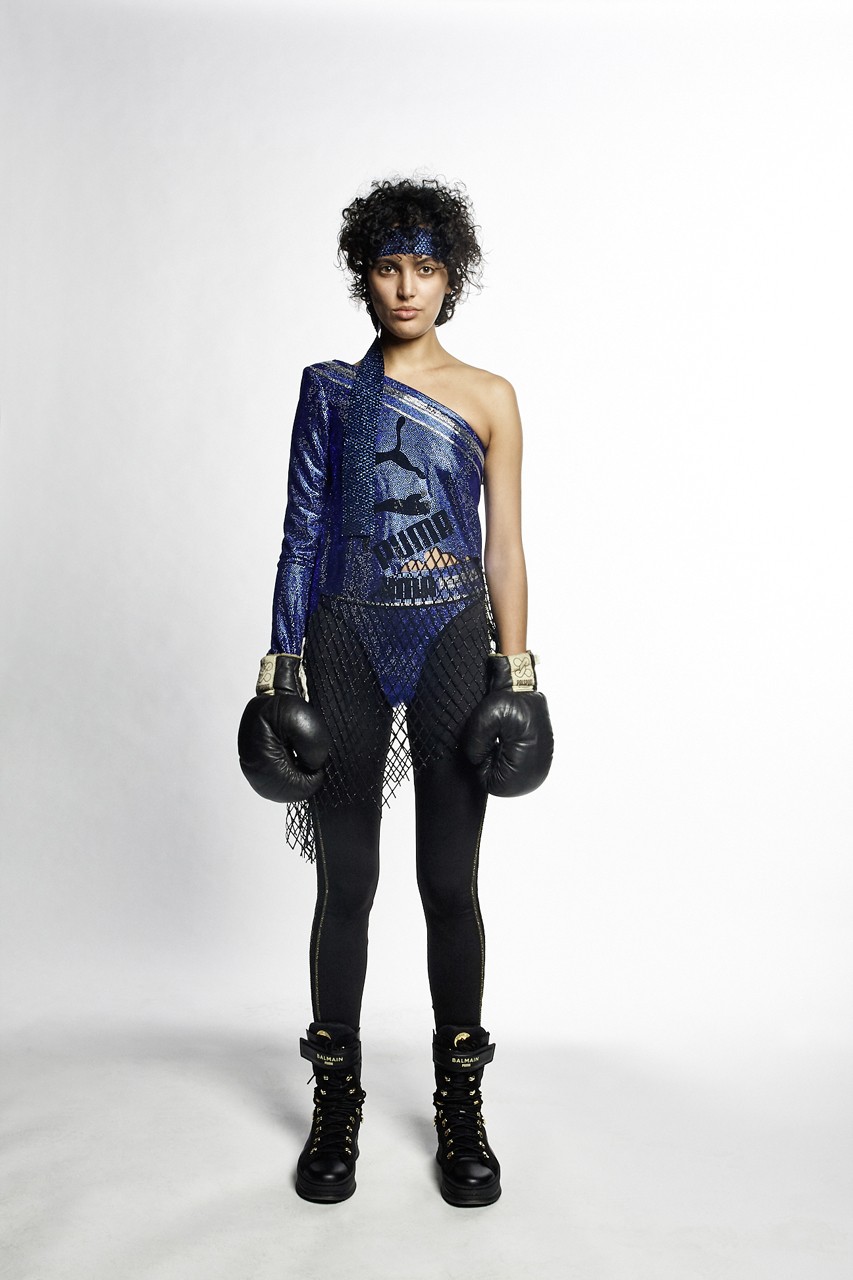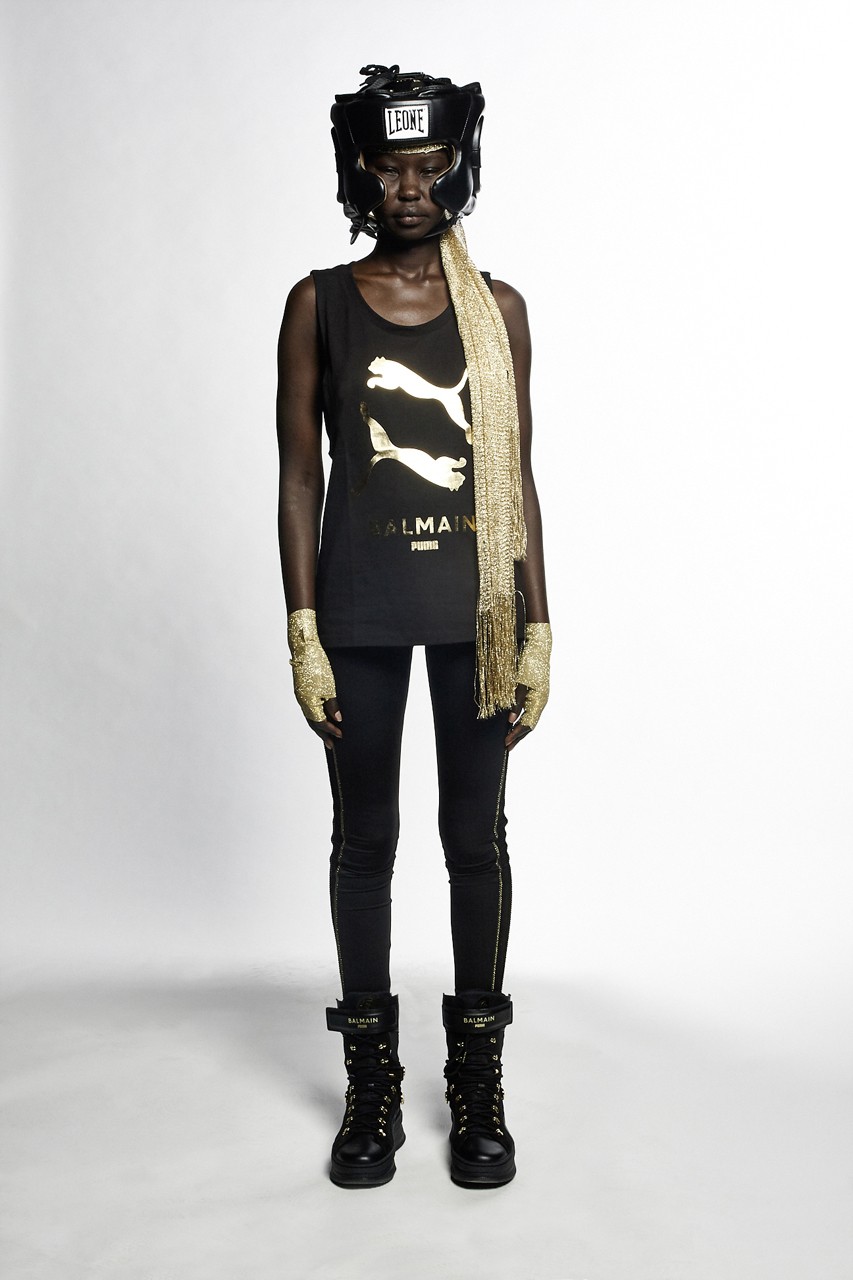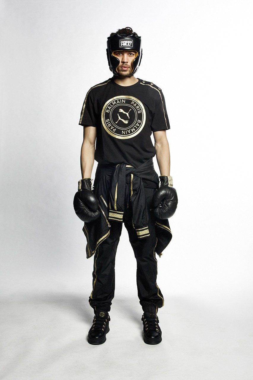 Verzameling PUMA x Balmain het combineert sport en mode, en de stukken zijn geïnspireerd boksen en Parijse couture. Zo omvat de collectie naast de tops en bottoms van sportkleding ook bh’s, boxershorts en sneakers in een perfect kleurenpalet met gouden accenten.