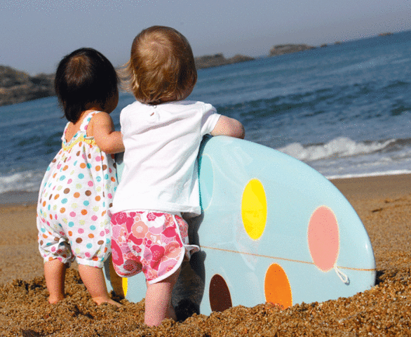 Linijo oblačil in obutve Roxy Baby za deklice odlikujejo sodobnost, domišljija in nežnost. Oblačila so izdelana iz lahkega bombaža s cvetnimi ali “polka-dot” potiski. Oblekice z volančki ali krilca z integriranimi športnimi hlačkami bodo deklicam dajala ugodje in sproščenost pri igri. Za poletne dni, ko bo sonce pokazalo svoj obraz, so kopalke s kopalnimi hlačkami odlična izbira. Roxy Baby ni pozabil niti na prve korake in strasti do zbiranja prvih modnih čeveljcev. Za zaščito pred UV- žarki so na voljo posebne lycra majčke in safari klobučki, ki pokrijejo občutljive dele, kot so glavica, vrat in ramena. Če dodamo še originalne potiske in modne barve v roza, zeleni in beli, bodo naše male damice prave otroške nagajivke na peščenih plažah. Malo večje deklice bodo našle navdih oblačenja v kolekciji Roxy Teenie Wahine, ki je namenjena deklicam, starim od dveh do sedmih let. Linijo zaznamujeta kreativnost in svežina z odtisi srčkov, pik in cvetlic. Hipijevski navdih s celo paleto odtenkov rožnate, lila, jagodne barve in malo svetlejših barv, kot so marelična, svetlo zelena, bela in vojaško modra, bo prav gotovo osvojil omare naših deklic. Bombažna oblačila dopolnjujejo razno vezenje, volančki, robovi in gumbi. Za skoraj čisto prave najstnice, stare od osem do trinajst let, je tu Roxy Girl kolekcija. Barve so nevtralne: črna, siva, zelena, rumena in rožnata. Za fante velja stari rek: kakršen oče, takšen sin. Kolekcija za fante Mini me se zgleduje po moški liniji. Otroško razposajena linija Quiksilver Baby, Boys, Youth & Toddlers novega člana družine spremeni v pravega malega surferja. Polinezijski printi, prostoročne risbe in napisi, kot so My father is a pro surfer, Born To Surf ali Dream Land. Za piko na i so tu še razni klobučki, kape in natikači. Letošnje poletje bodo očki ponosno učili svoje malčke prvih surferskih korakov, mamice pa se bodo ob tem brezskrbno sončile.