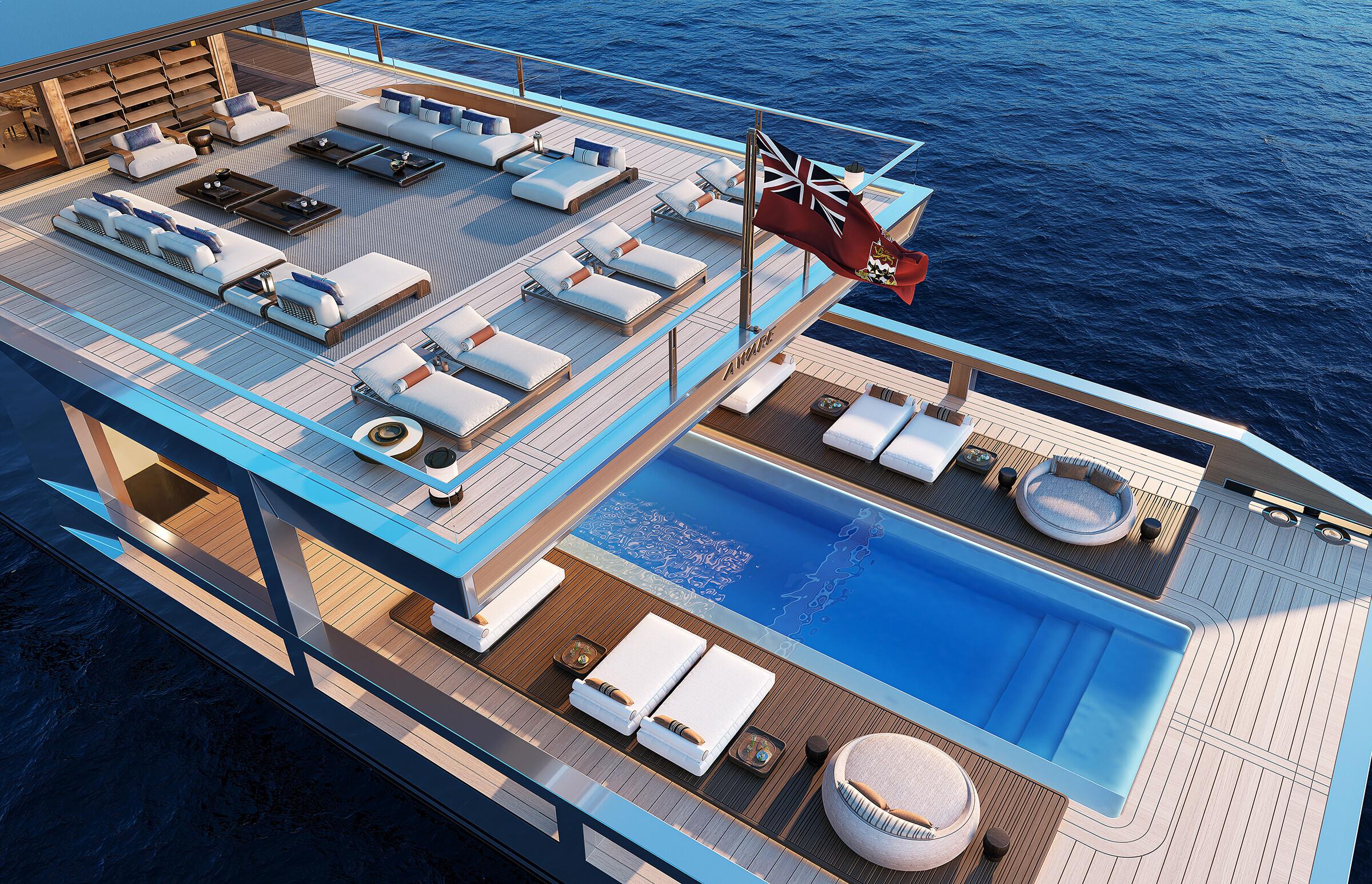 Sander J. Sinnott, het genie achter dit wonder, benadrukt op AWARE de ‘overvloed aan ruimte’. En hij had geen ongelijk. Met een strand van 230 m2 en een zwembad van 11 meter lang is dit jacht eigenlijk een drijvend resortcomplex. Alleen al de beachclub biedt al 121m2 ruimte. Dat is groter dan de meeste herenhuizen!