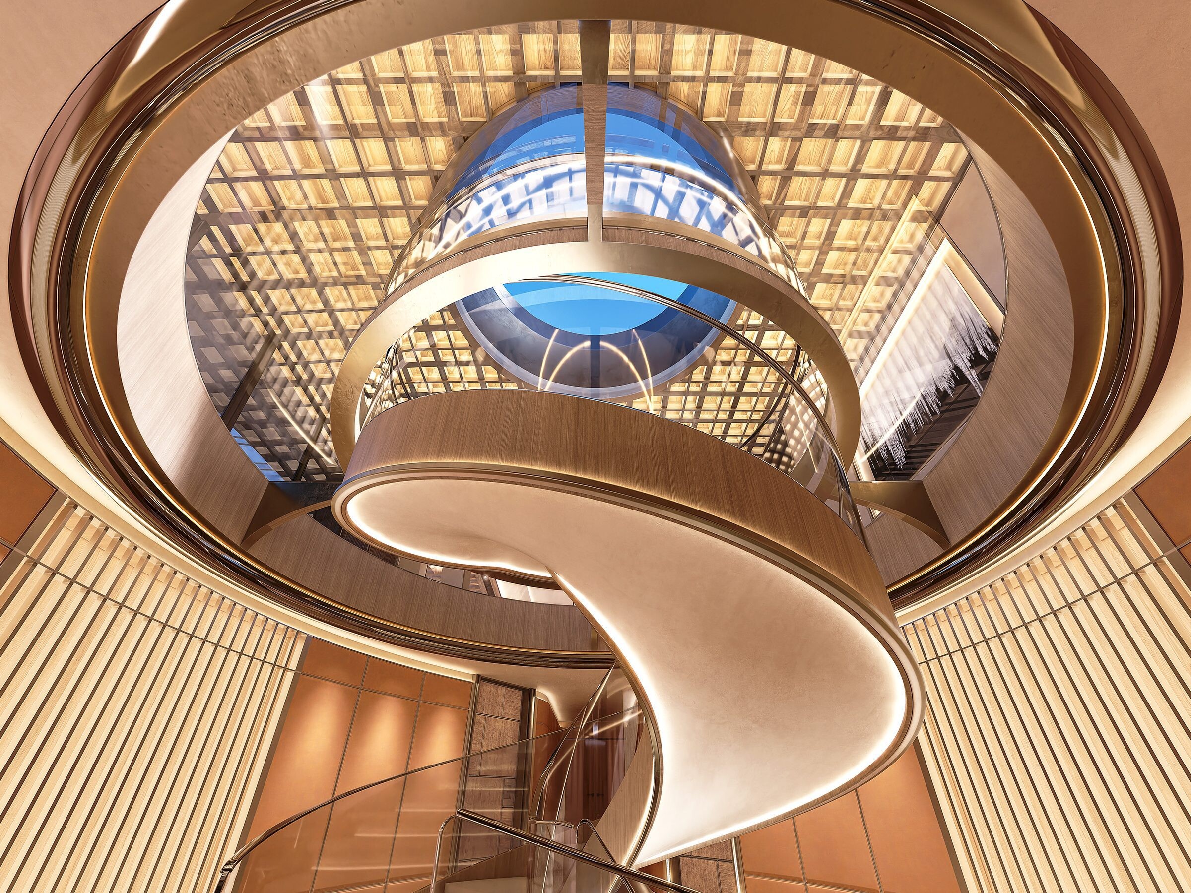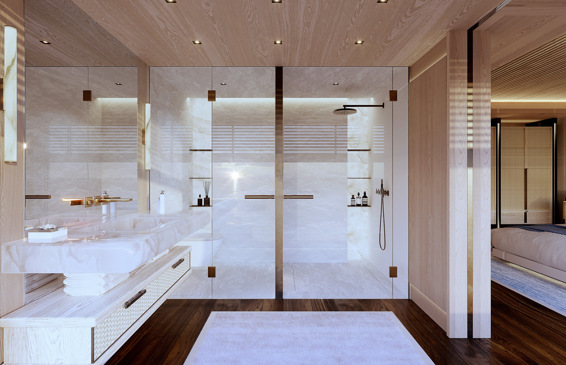 De Beach Club, met zijn plafonds van 10 meter hoog, is waar de magie gebeurt. Bij AWARE-design draait alles om het optimaliseren van de ruimte, wat een mooie manier is om te zeggen dat deze enorm is. Maar het gaat niet alleen om de grootte; het gaat erom dat elke centimeter telt. Het jacht belooft overal aan boord uitzicht op de oceaan. Ja, zelfs vanaf het toilet. Waarom niet?
