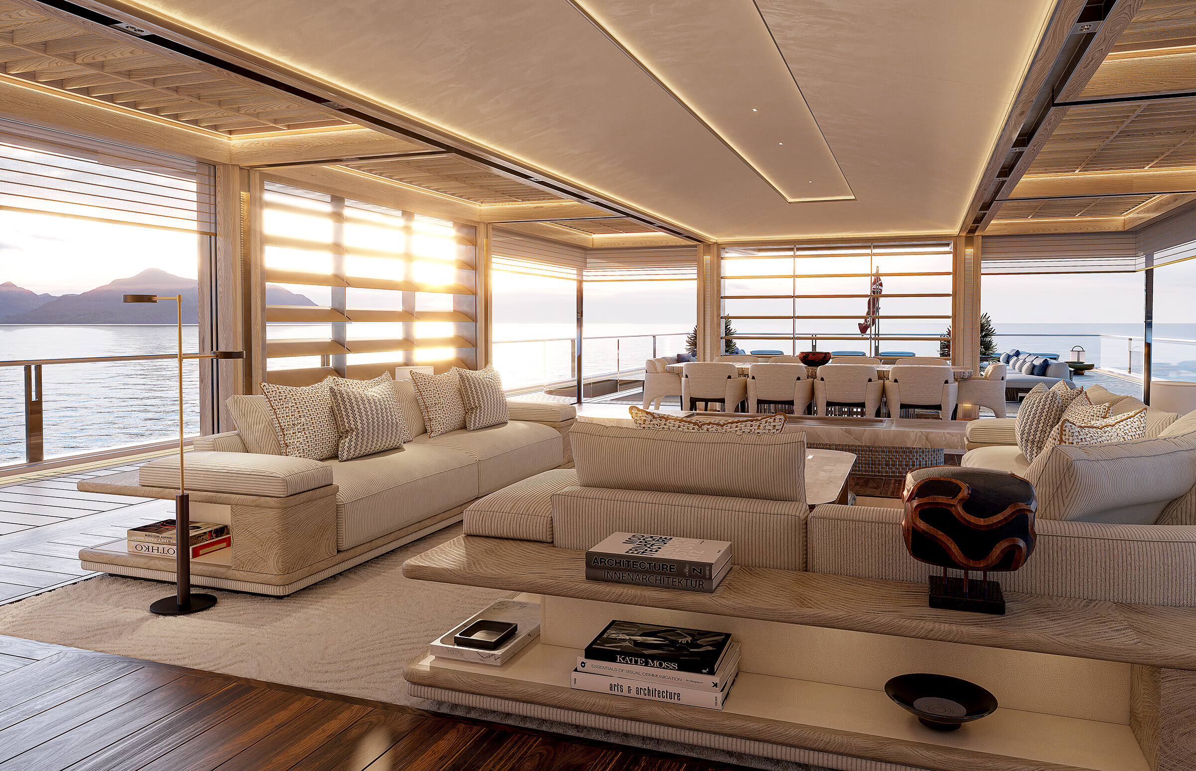 De Beach Club, met zijn plafonds van 10 meter hoog, is waar de magie gebeurt. Bij AWARE-design draait alles om het optimaliseren van de ruimte, wat een mooie manier is om te zeggen dat deze enorm is. Maar het gaat niet alleen om de grootte; het gaat erom dat elke centimeter telt. Het jacht belooft overal aan boord uitzicht op de oceaan. Ja, zelfs vanaf het toilet. Waarom niet?
