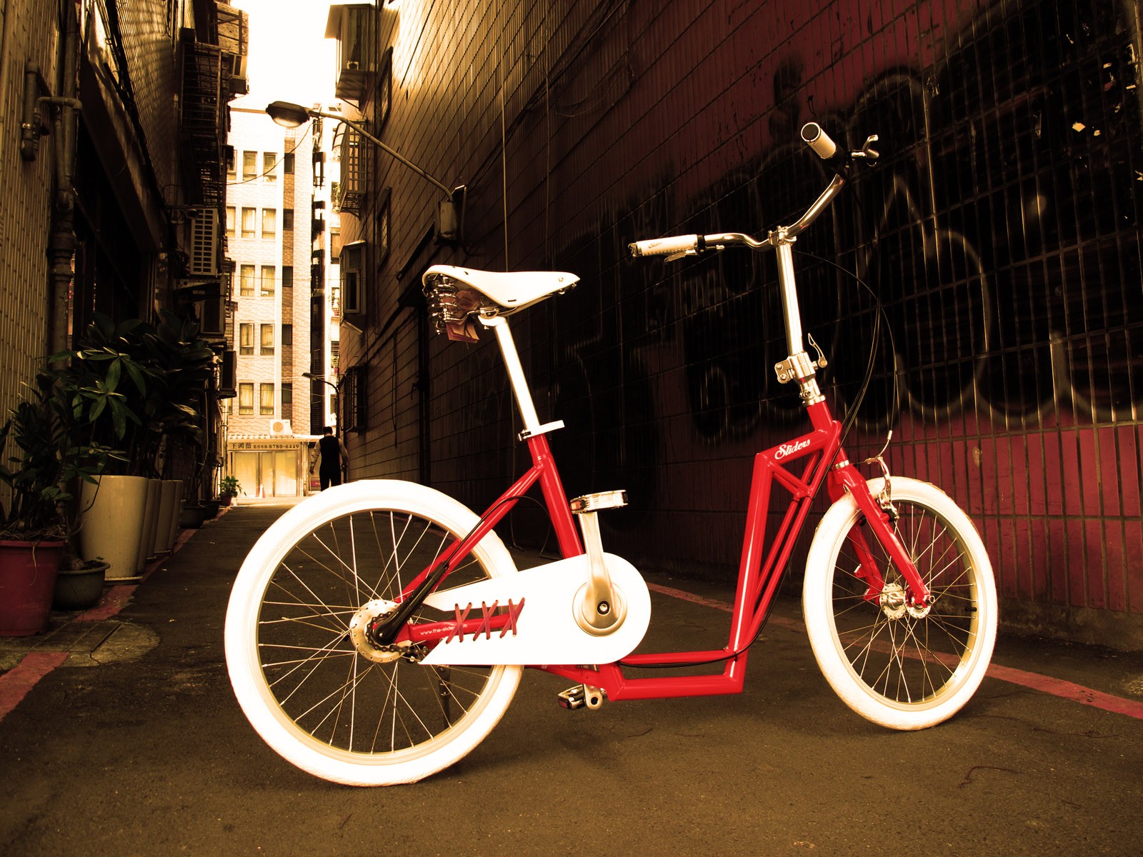 Sliders is een vouwfiets die tevens een scooter is. Het unieke frameontwerp zonder bovenste dwarsbuis biedt de mogelijkheid om hem als een ski te duwen. Vraagt u zich af waar het nut van deze hybride zit? Het is een briljant concept, vooral voor grote steden waar voetgangers en fietsers vaak de ruimte delen. Op dergelijke plaatsen (voetgangerszones etc.) moet je normaal gesproken je fiets naast je duwen, maar in plaats daarvan kun je hem nu comfortabel als een scooter voortduwen, wat sneller is dan lopen, maar nog steeds veel veiliger voor voorbijgangers. Met een lichte trap in het pedaal klap je hem in en met het stuur duw je hem net als een handmatige grasmaaier naar de "rustplaats".