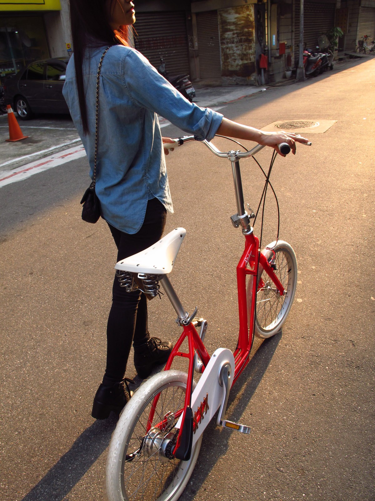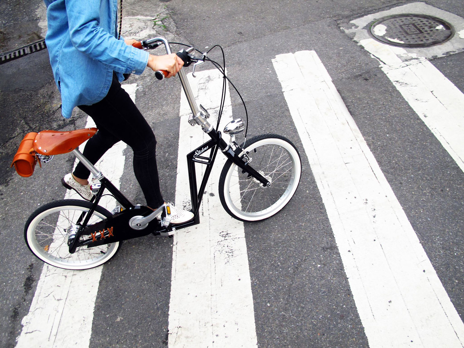 Schuifregelaars het is een vouwfiets die ook nog eens smal is, omdat het ontwerp de belangrijkste kenmerken van beide transportmiddelen combineert en als zodanig ideaal is voor stedelijke omgevingen waar de toegestane snelheden drastisch veranderen. Je kunt er ook mee vervoeren in een rok of jurk, zonder het risico te lopen de jurk te verpesten (de ketting is bijna volledig verborgen). Lichte pedaaltrappen en de fiets is al in tweeën gedeeld (in "natuurlijke maat" wordt hij vastgehouden door twee scharnieren), wat gemakkelijker opbergen en transporteren mogelijk maakt.