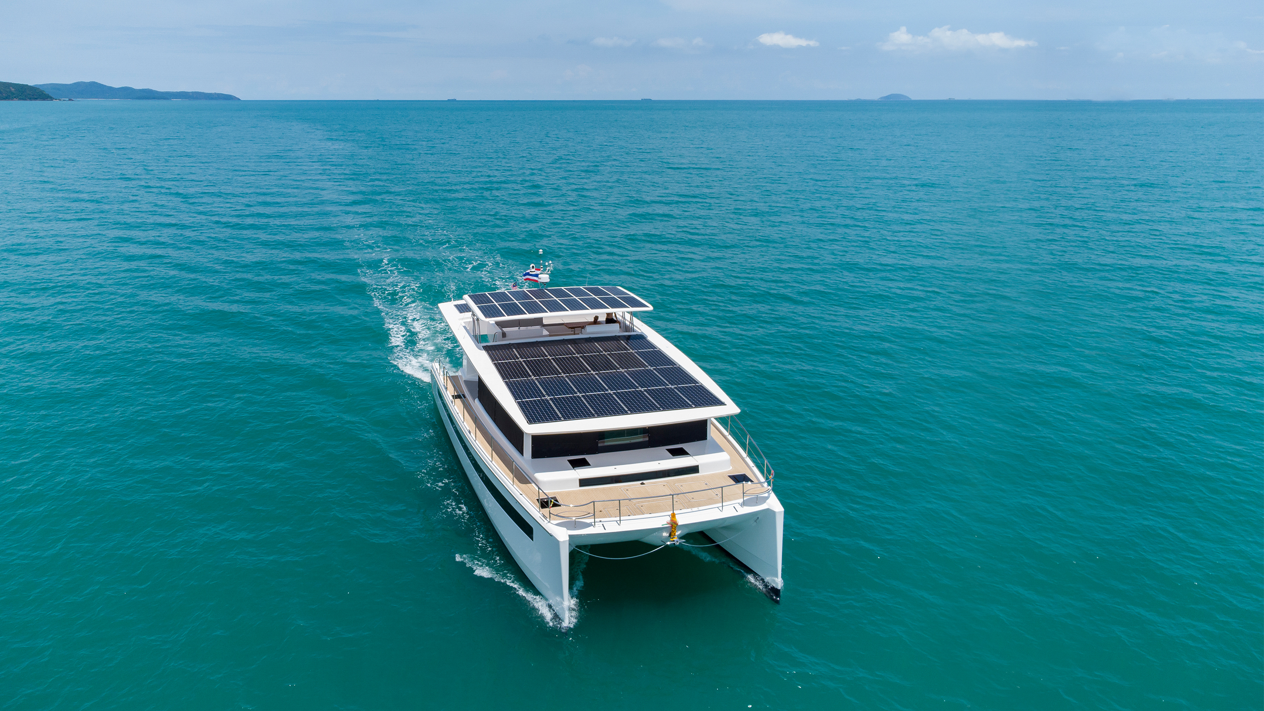 Silent-Yachts Silent 60 is de nieuwste catamaran uitgerust met zonnepanelen en een vlieger. 42 zonnepanelen voorzien 17 kWp, en deze energie drijft vervolgens twee elektromotoren aan, die elk een 200 kW krachten. 18 meter de catamaran heeft een capaciteitsaccu 286 kWh, waarmee een dagelijks vaarbereik van maximaal 100 zeemijl. In het voorste gedeelte van de catamaran vinden we een plek waar de lijnen en de elektrische lier zijn opgeborgen.